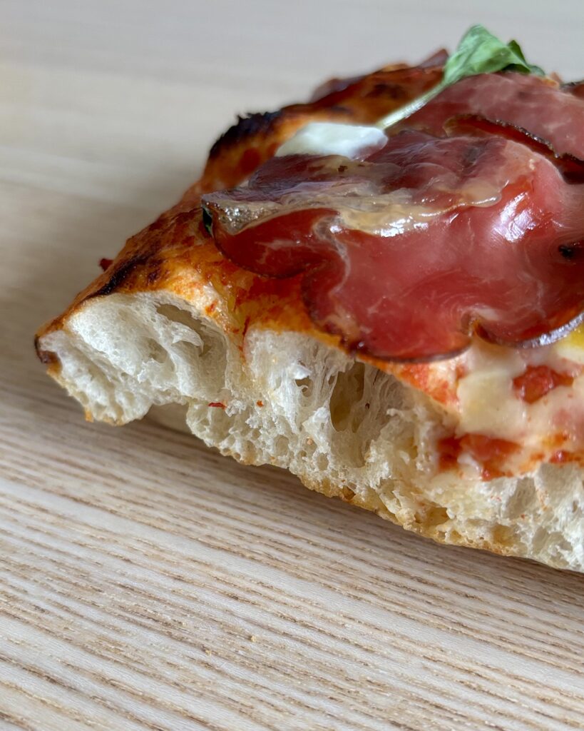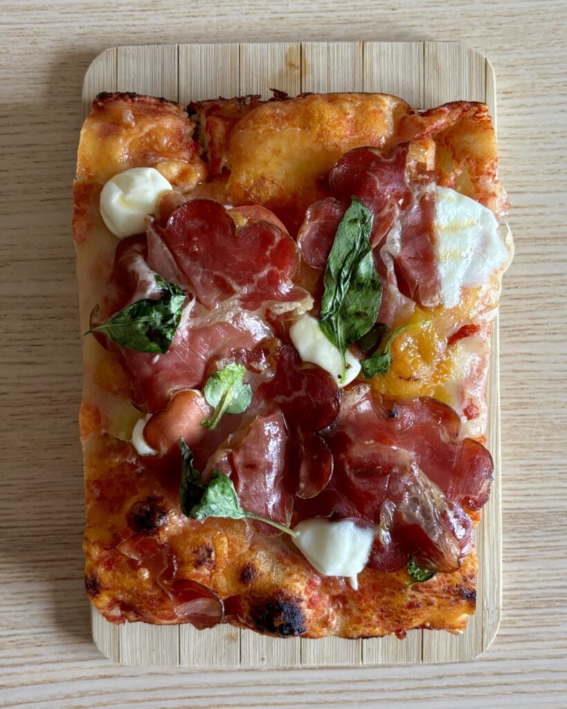 - une délicieuse tranche de focaccia garni de tomates cerises, mozzarella et coppa (13.9 CHF), avec une pâte dodue et croustillante pleine de bulles. L’autre focaccia du jour, en mode « sandwich » avec du jambon ou speck, avait également une très bonne tête (on a longuement hésité entre les 2…)