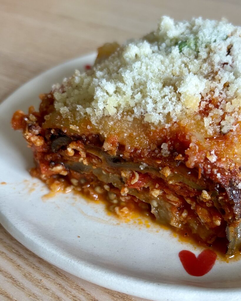 - de la parmigiana (8.9 CHF), plaisante au niveau du goût mais aux tranches d’aubergine qui auraient mérité plus de cuisson/de friture pour être fondantes