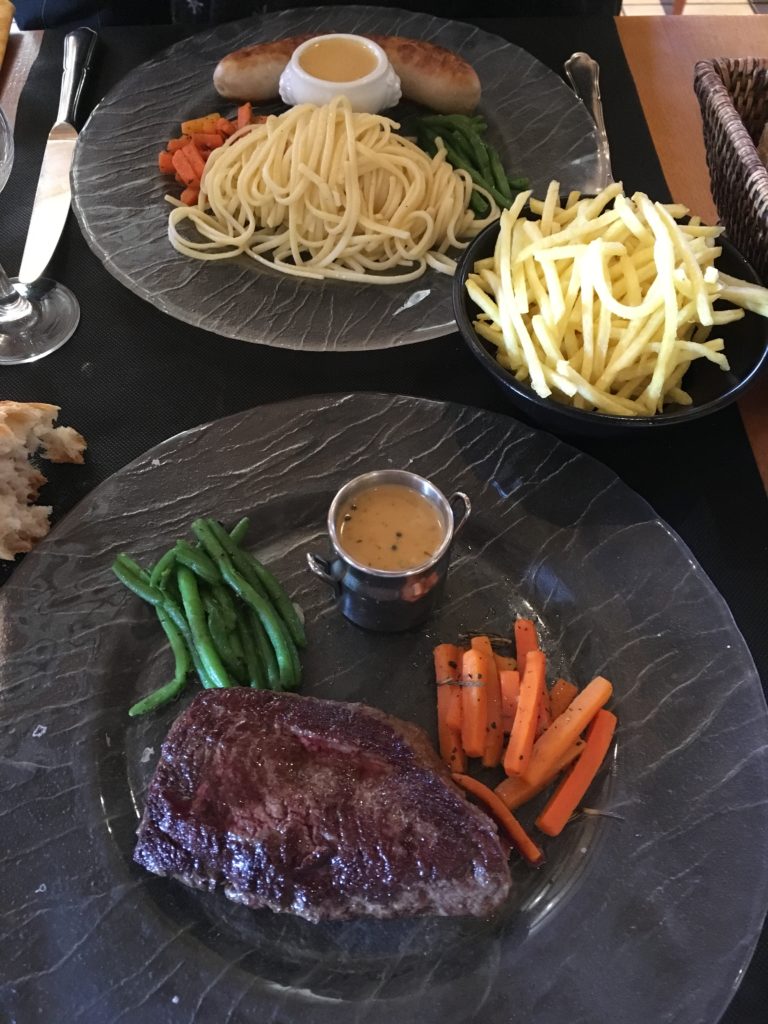 • un autre plat du jour avec un steak de boeuf, sauce au poivre, légumes et frites allumettes, très correct, avec un bon rapport quantité/prix