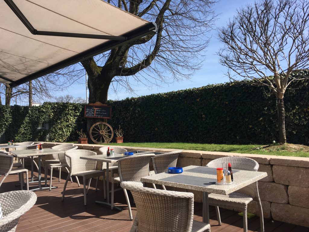 La terrasse, séparée de la route par de hautes haies, est plutôt agréable. Quant à  l’intérieur, il  est divisé entre la salle du café (pour les fromageux) et celles du restaurant (sans).