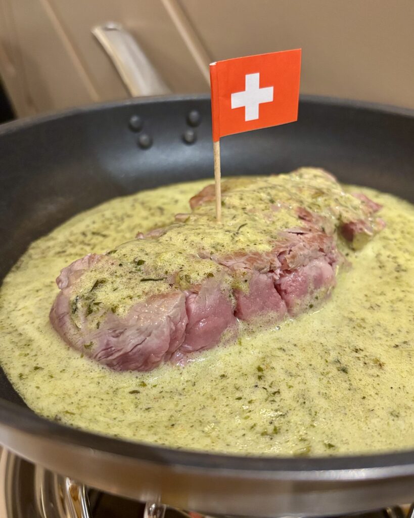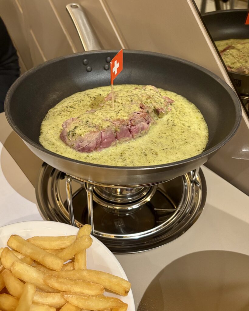 - la tendre entrecôte suisse sur réchaud et poële (40 CHF), nageant dans un beurre Café de Paris et servie avec de bien bonnes frites dodues crousti-moelleuses. Servie bleue, la viande est ensuite à cuire selon ses goûts.