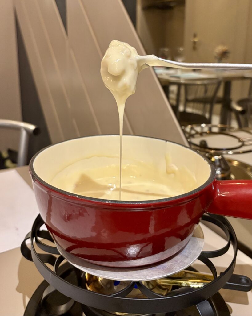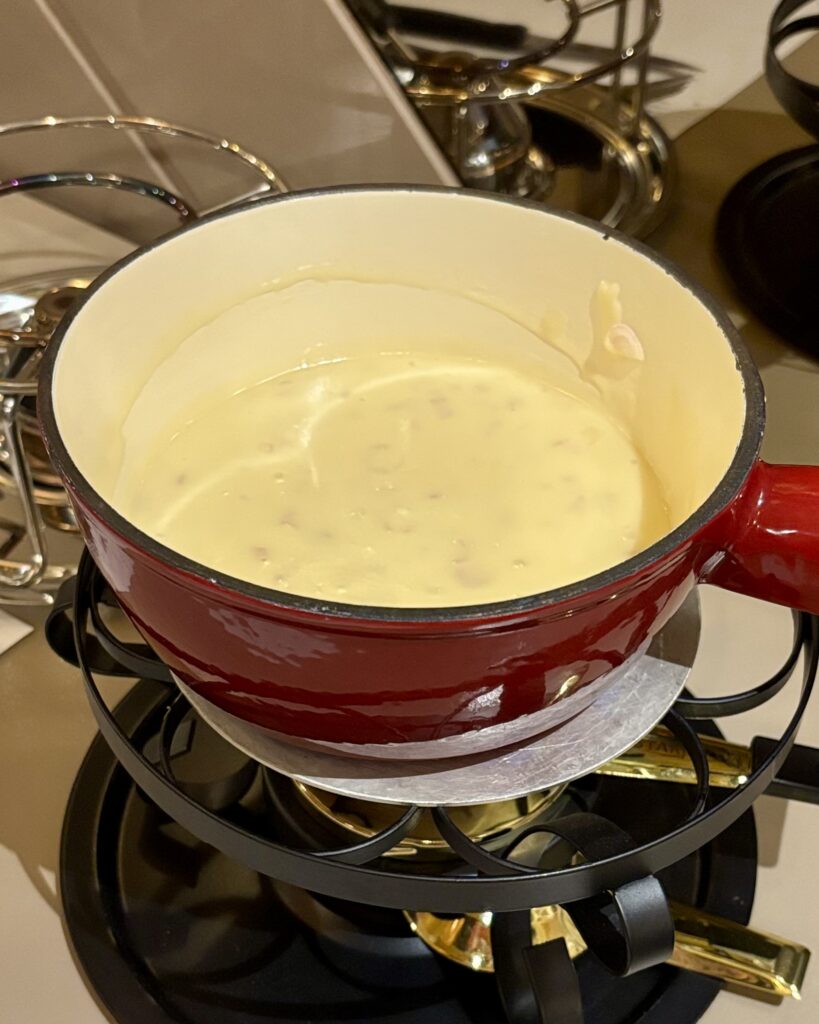 - une délicieuse et crémeuse fondue moit’-moit’ à l’échalote (23 CHF; proposée à 21 CHF pour les militaires de la caserne de la ville), à base de fromage de Billens de Benoît Gobet (fromagerie bien locale située à 13km de Moudon). Bien équilibrée, elle se mange sans faim.