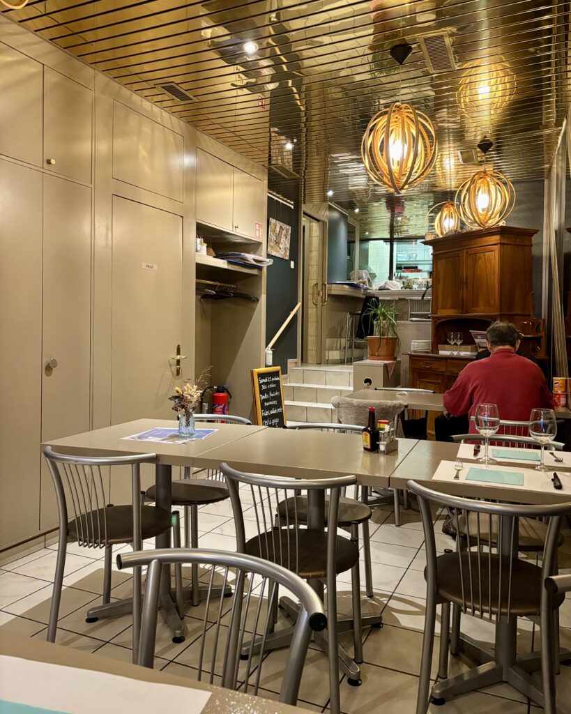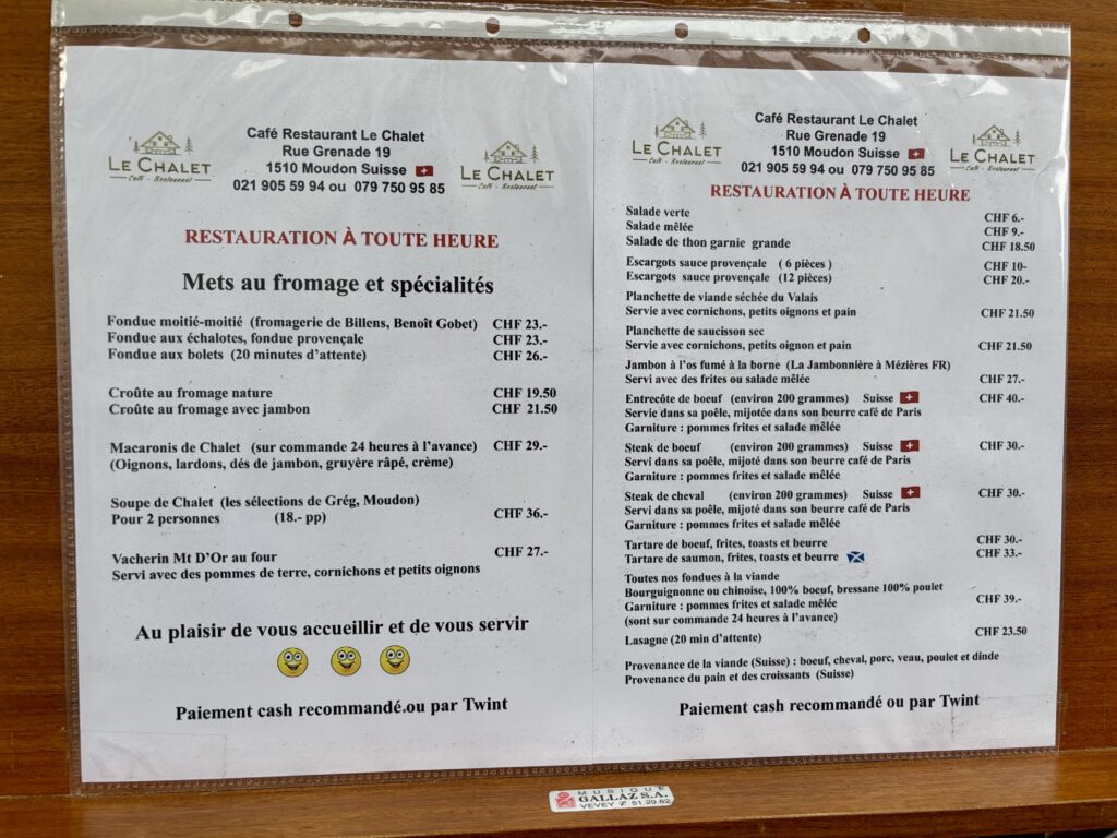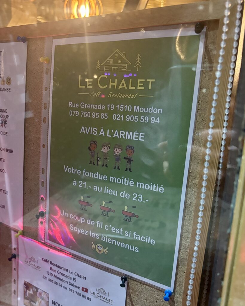C’est par un heureux hasard qu’on a atterri dans ce bistrot un soir d’octobre 2025: sortant des stylés Musée du Vieux Moudon et Musée Eugène Burnand (du nom du peintre suisse natif de la ville et fameux pour ses oeuvres autour du monde campagnard), à force de voir des vaches…on a eu une petite envie de fondue (élémentaire, mon cher Watson). Pour les curieux, en fin de texte se trouvent d’ailleurs quelques photos de l’exposition qui se visite le mercredi, samedi et dimanche de 14h à 18h.