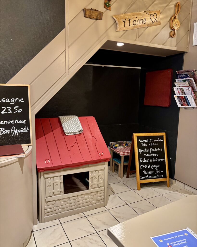 Pour les mini-Comparses que cela intéresse (c’est assez rare pour être souligné): le coin jeux comporte une maisonnette, des duplos, moult petites voitures, des puzzles et des livres.
