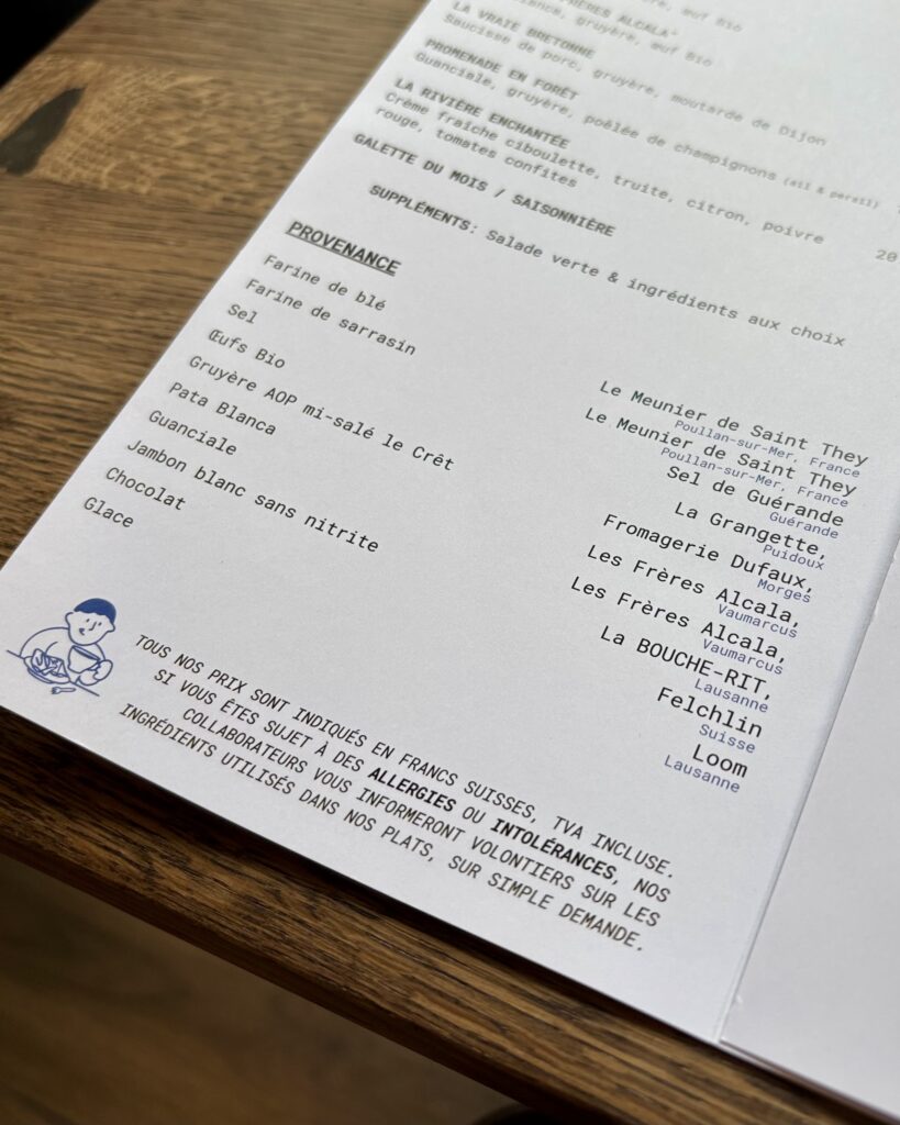Le menu détaille les différents ingrédients et fournisseurs: farines bretonnes du Meunier de Saint Theil de Poullan-sur-Mer, sel de Guérande, oeufs bio de la Grangette à Puidoux, gruyère AOP de la Fromagerie Dufaux à Morges, jambon cru et guanciale des espagnols Frères Alcala dans le canton de Neuch’, jambon blanc (précisé sans nitrite) de la Bouche-rit, chocolat Felchlin et glaces lausannoises de chez Loom.