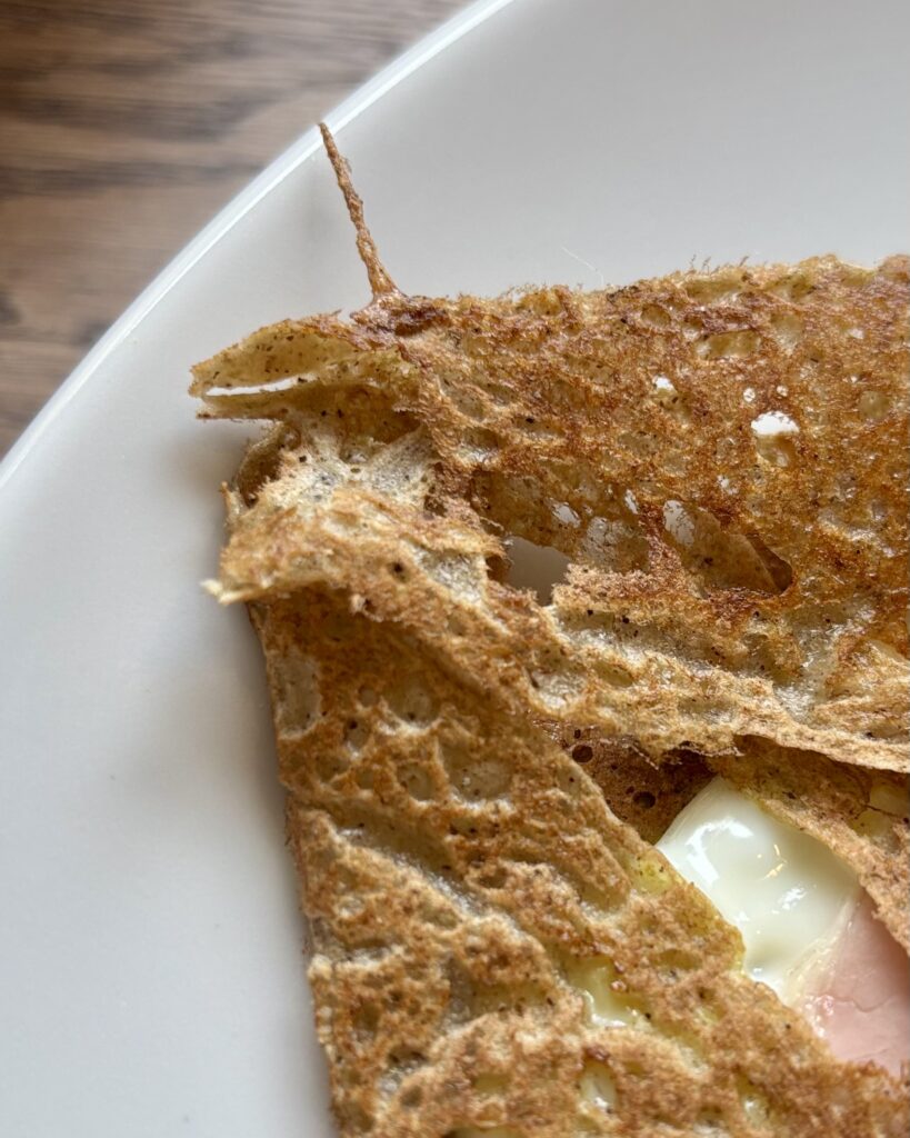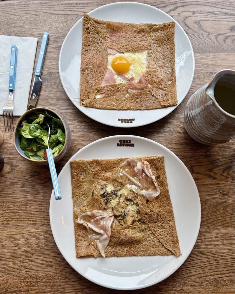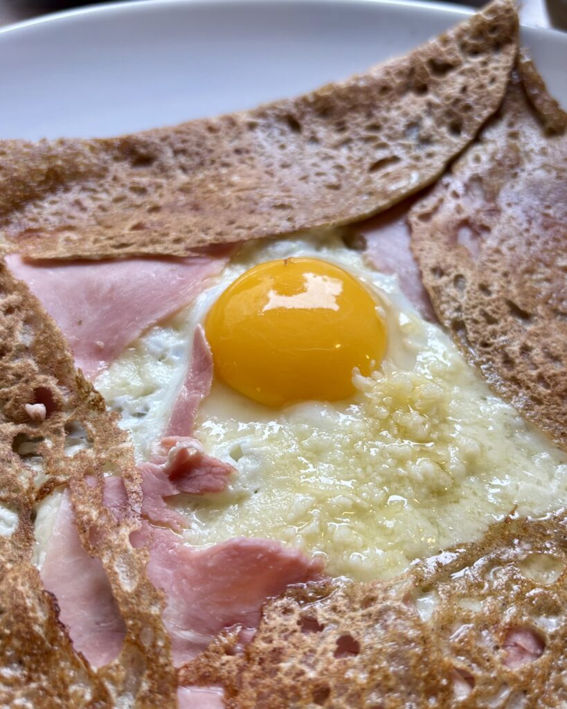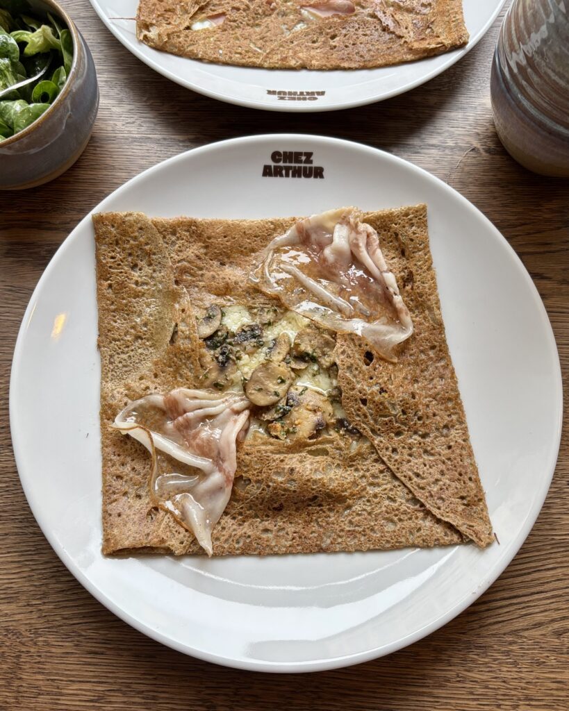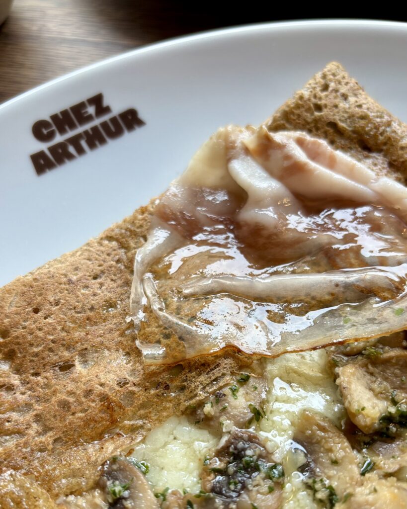 - une galette complète « chez Arthur » (17.5 CHF) garnie de jambon blanc, gruyère AOP et oeuf au plat, classique et efficace