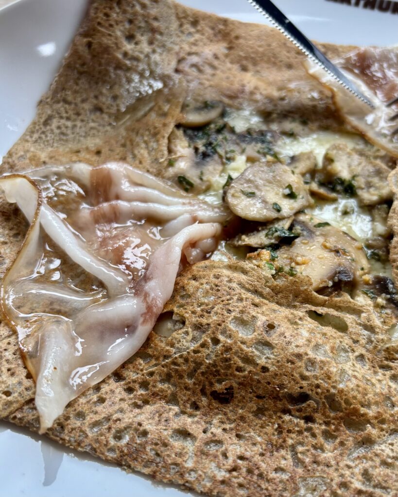 - une bien bonne galette « promenade en forêt » (18.5 CHF), avec un duo de fines tranches de guanciale un peu posées comme du lardo di Colonnata, presque translucides, gruyère AOP et goûtue poêlée de champignons persillée. Pour ceux qui se poseraient la question, il n’est pas possible d’avoir uniquement des champignons sans ail ni persil, car le chef concocte le tout ensemble.