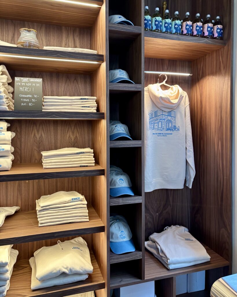 La salle a gagné en lumière et s’ouvre sur le bar et la partie boutique, où casquettes, t-shirts et pulls brodés au logo de l’enseigne sont proposés à la vente (ce qui peut rappeler la partie concept store du Luma Café & more à Genève).
