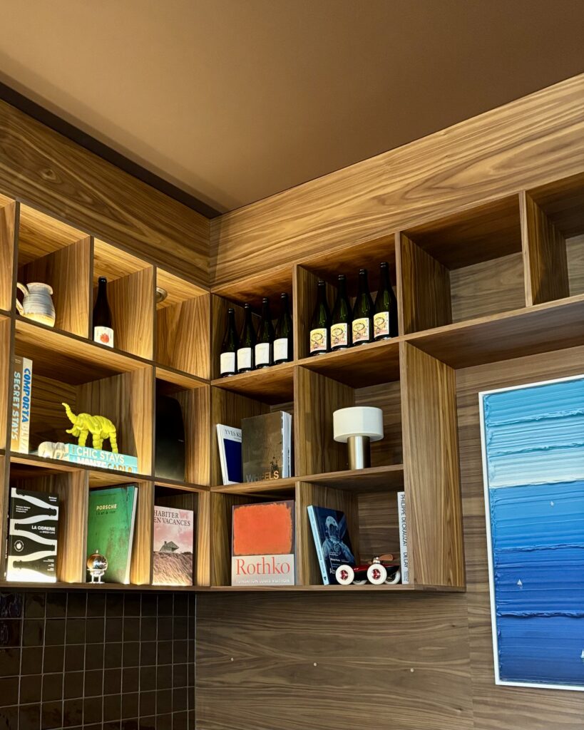 Un doux mélange de bouteilles, carafes, objets de déco divers et livres habille les étagères du haut du fond de la salle.