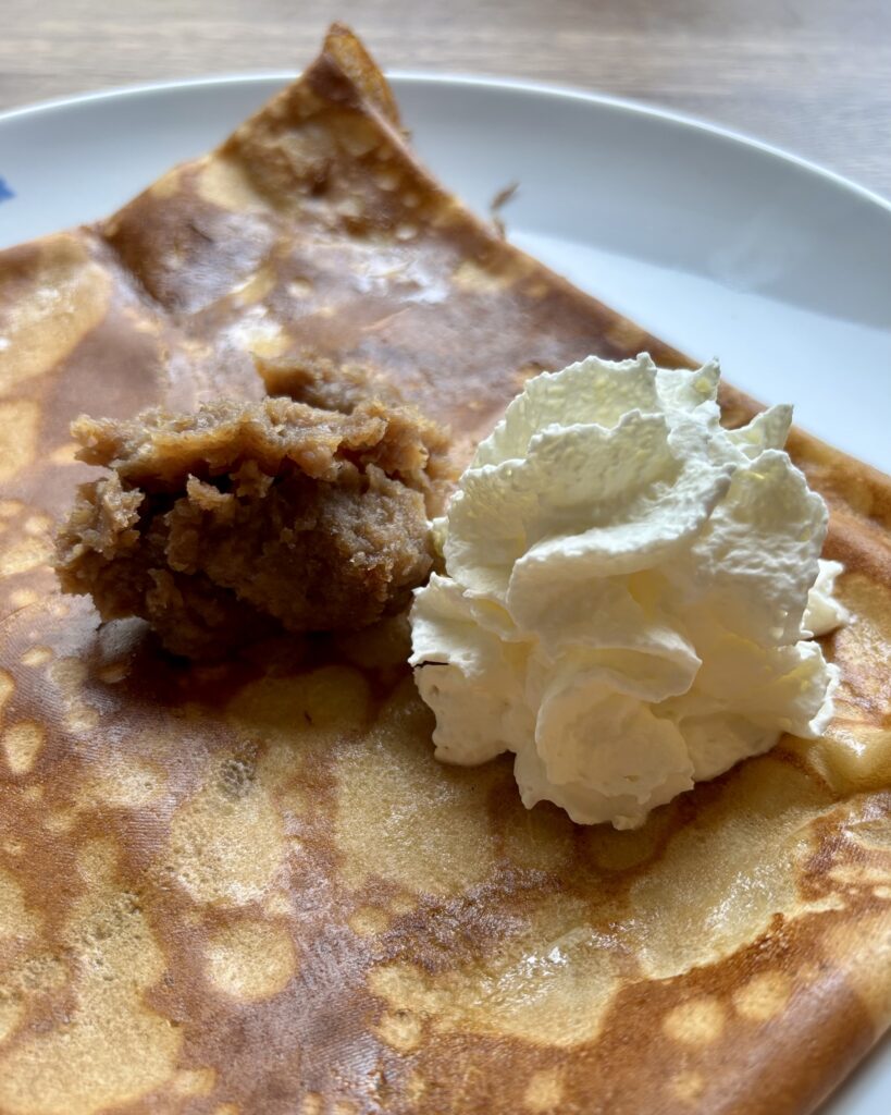 - une crêpe à la crème de marron maison (12 CHF) et supplément de crème chantilly, simple et efficace, un poil fine peut-être à notre goût