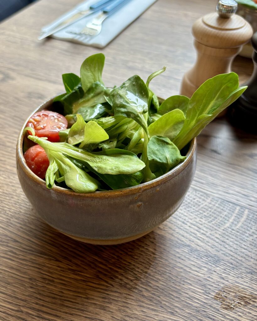 - une salade verte de rampon avec « la sauce secrète de Maman » (6 CHF), agrémentée de quelques tomates cerises, fraiche et efficace. La vinaigrette était très bonne.