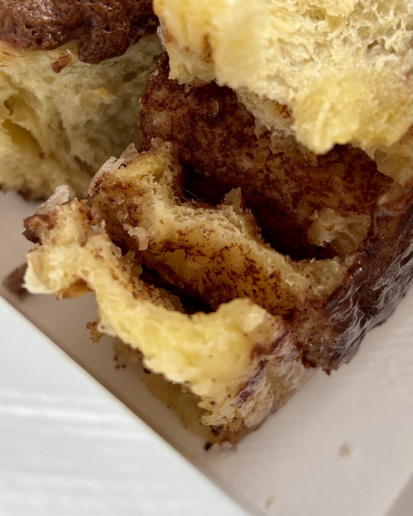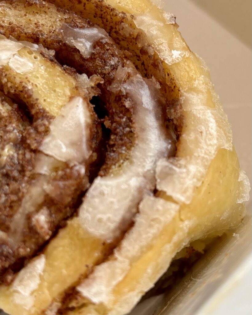 - notre préféré, sans aucun doute: le classique cinnamon roll, bien moelleux, à la pâte pas trop cuite mais juste assez, bien cannelée et avec un glaçage parfait d’une finesse qui croque tout de même légèrement sous la dent (rien à voir, mais cela nous rappelle le bien-aimé glaçage des donuts au sucre de Santa Pola, une de nos référence personnelle en terme de glaçage qui rend heureux)