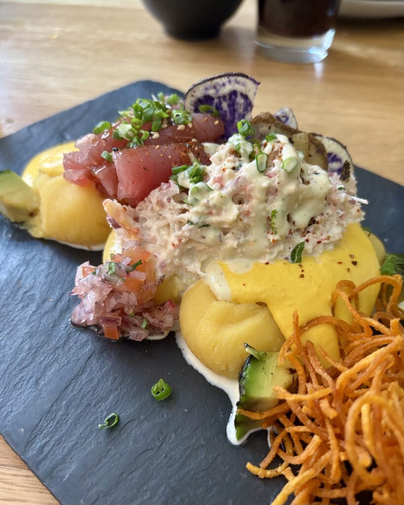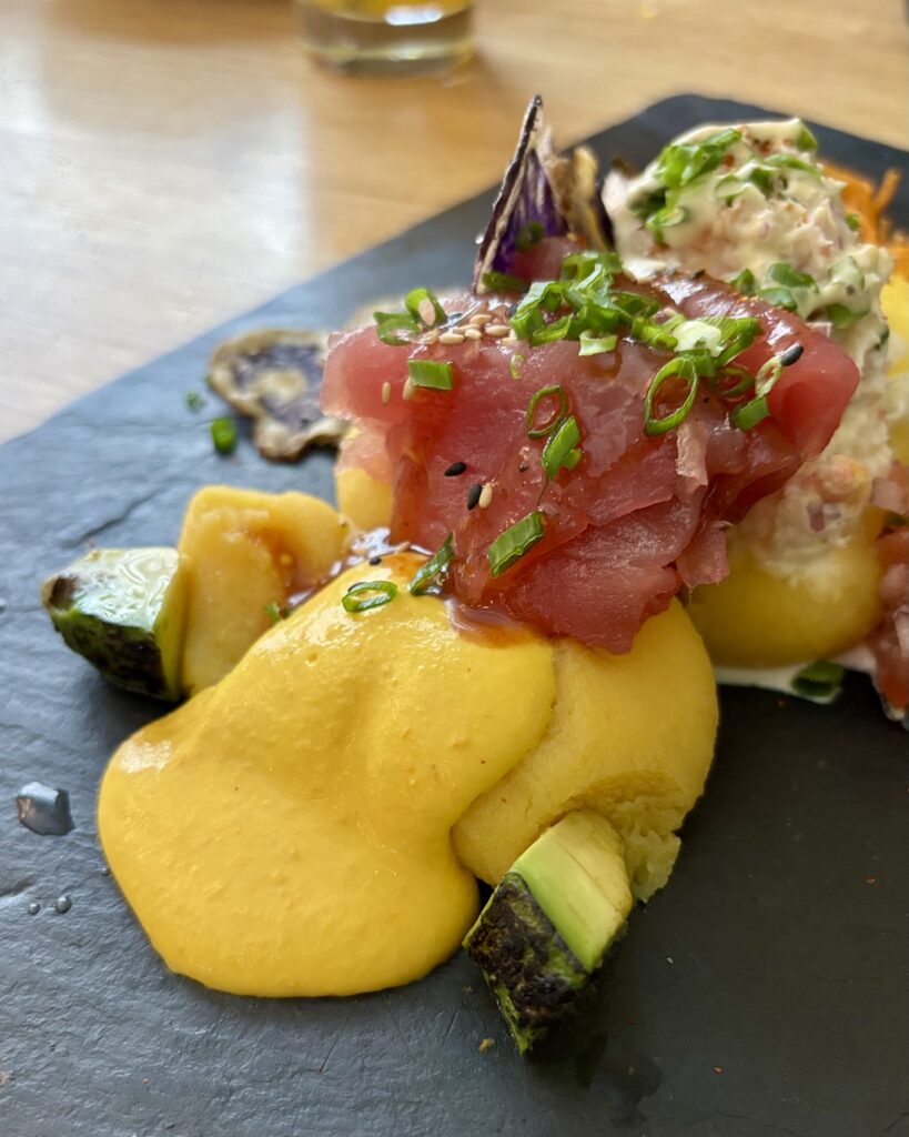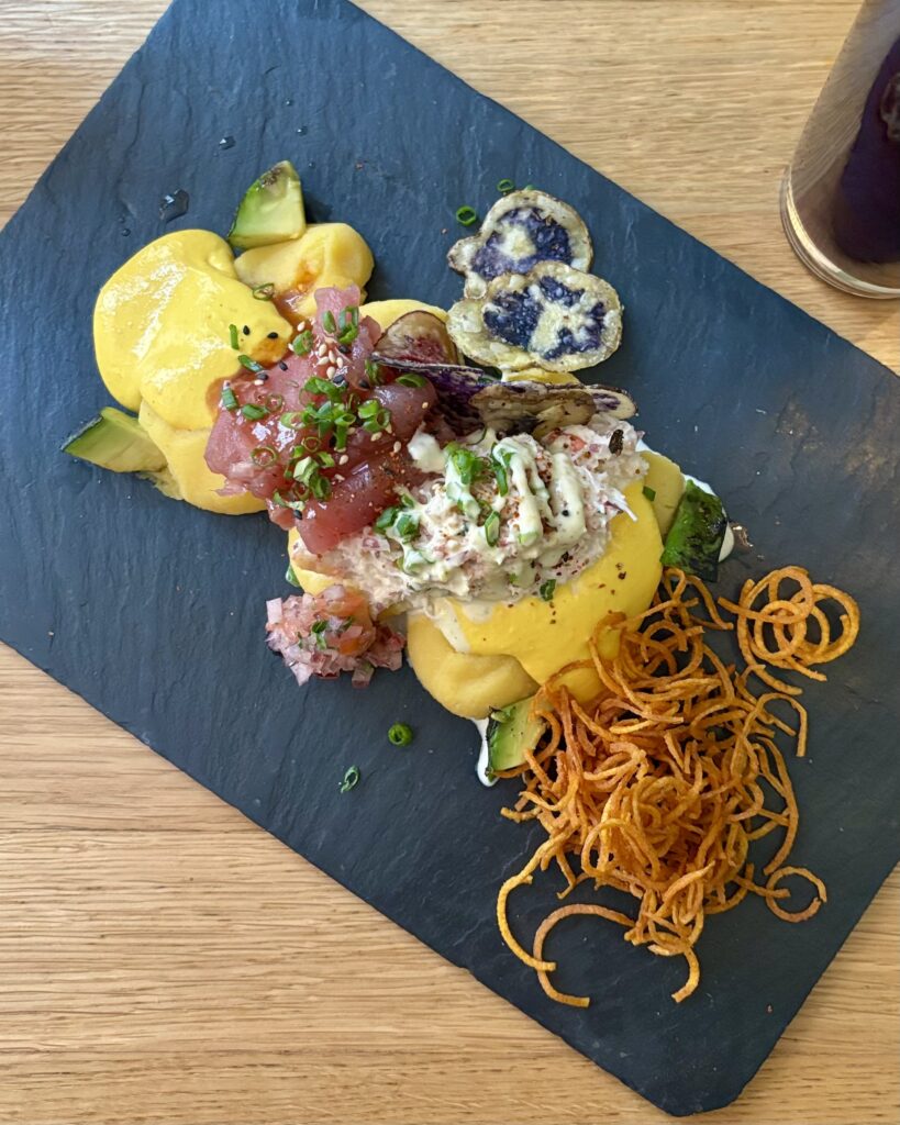 - (2026) le très beau (et délicieux) duo de causas (28 CHF), composé d’écrasé froid de pommes de terre au citron vert, chair de crabe, thon rouge, mayonnaise et sauce huancaina relevée. Les fines frites de patate douce étaient juste au top, à la fois graphiques et delicieuses.