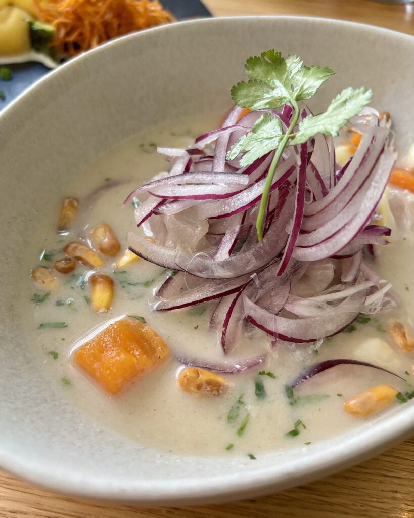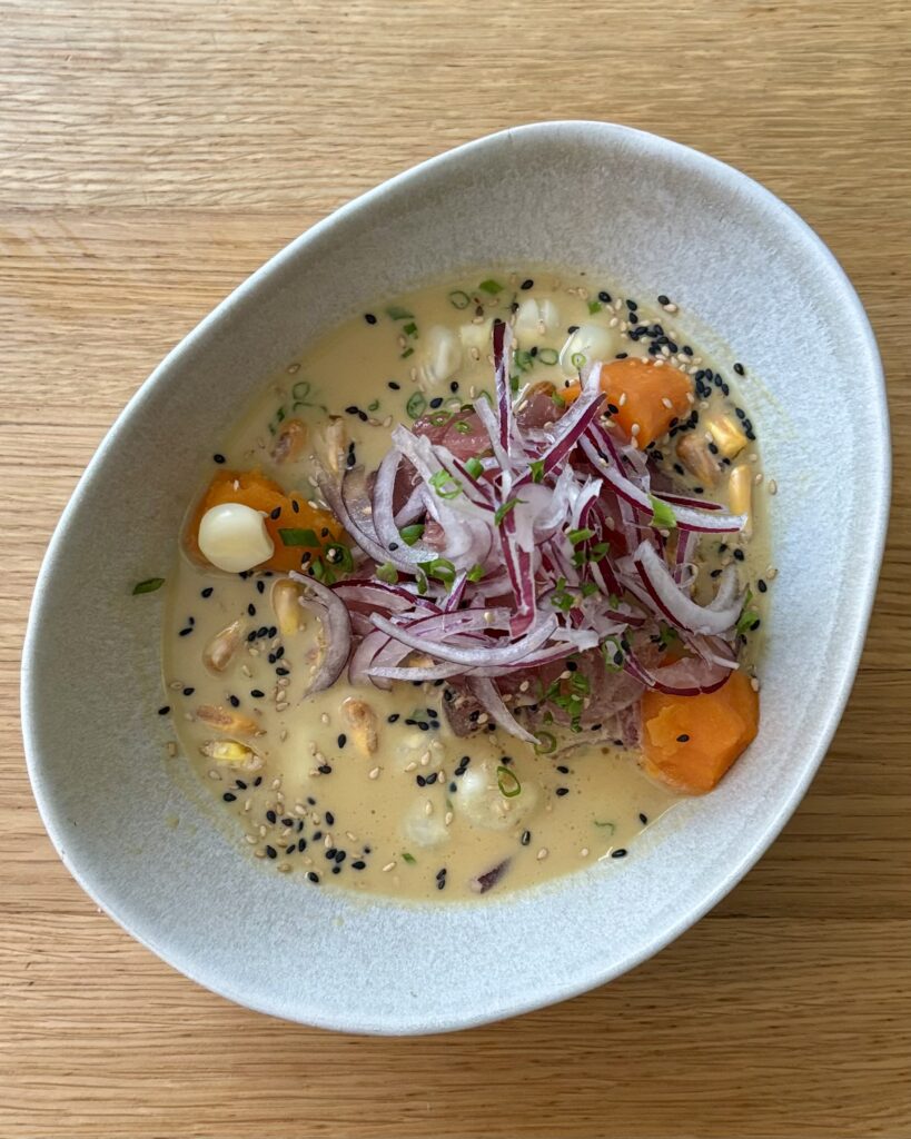 - (2026) le ceviche nikkei (28 CHF), composé lui de thon rouge cru, patate douce, maïs choclo et cancha, oignon rouge, avocat, coriandre et sa leche de tigre nikkei