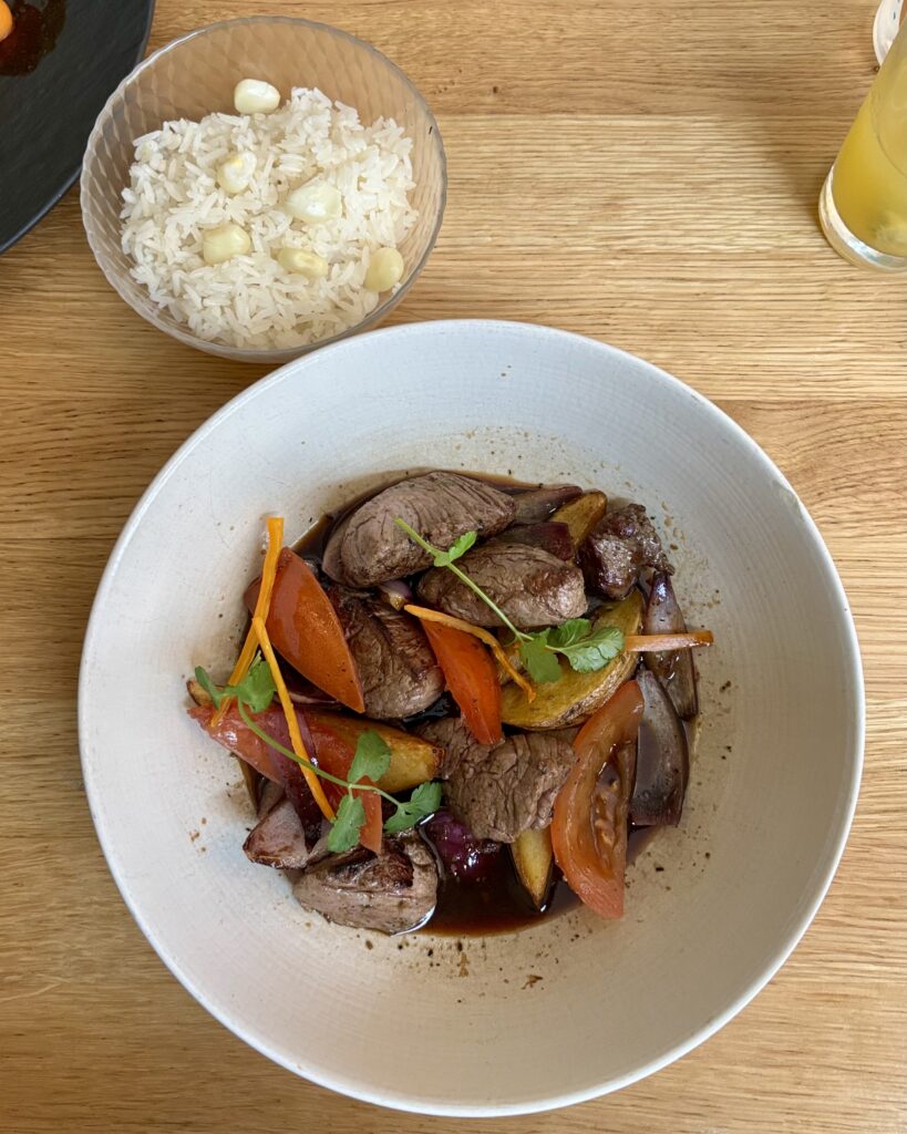 - (2026) le généreux lomo saltado (46 CHF), soit de tendrissimes morceaux de filet de bœuf sautés au wok dans de la sauce soja, bien saignants, tomates, oignons rouges, coriandre, pommes de terre maison accompagnés d’un bol de riz garni de gros grains de maïs