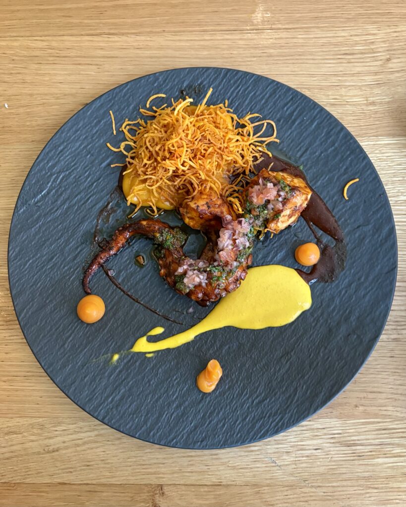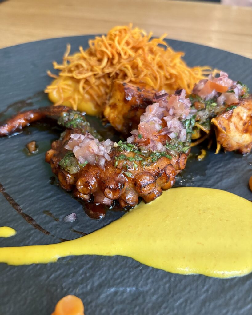 - (2026) le tendre pulpo anticuchero (42 CHF), grillé mariné à l’anticuchera, avec une sauce huancaina et une mousseline de patate douce