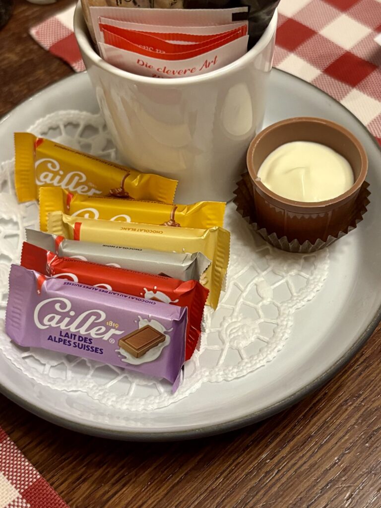 - (2022) le « trio helvète » en dessert, soit une combinaison de crème double de Gruyère/meringue, mousse au chocolat suisse et boule de sorbet aux abricots du Valais (14 CHF), plaisant et permettant d’avoir tant de la fraicheur fruitée que du plus gourmand.