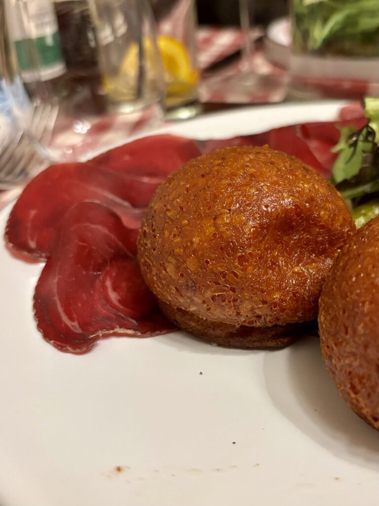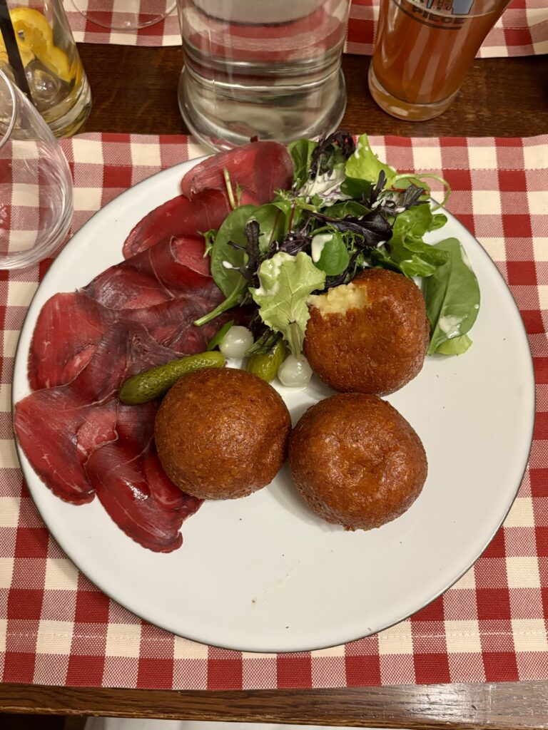 - (2026) l’assiette de 3 excellents malakoffs bien crousti-coulants, salade de mesclun et viande séchée du Valais (29 CHF – existe aussi avec 2 malakoffs à 23 CHF).