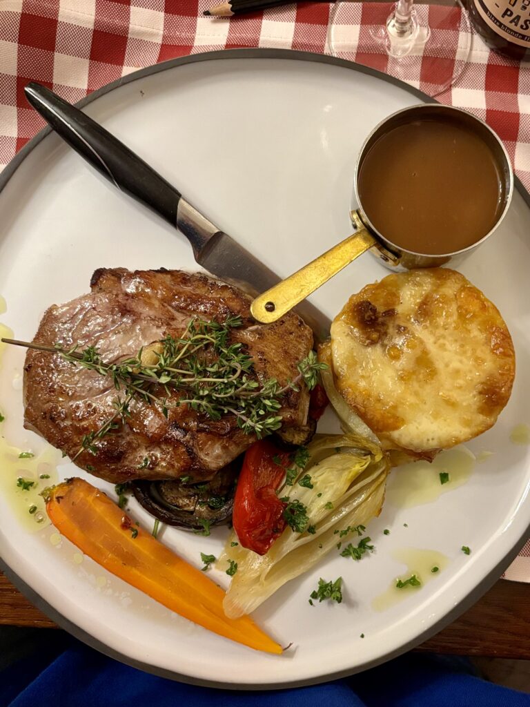 - (2026) la côte de porc fermière du domaine “Château-du-Crest” à Jussy GRTA, légumes du moment, gratin de pommes de terre, ail confit au lait et jus réduit (48 CHF)