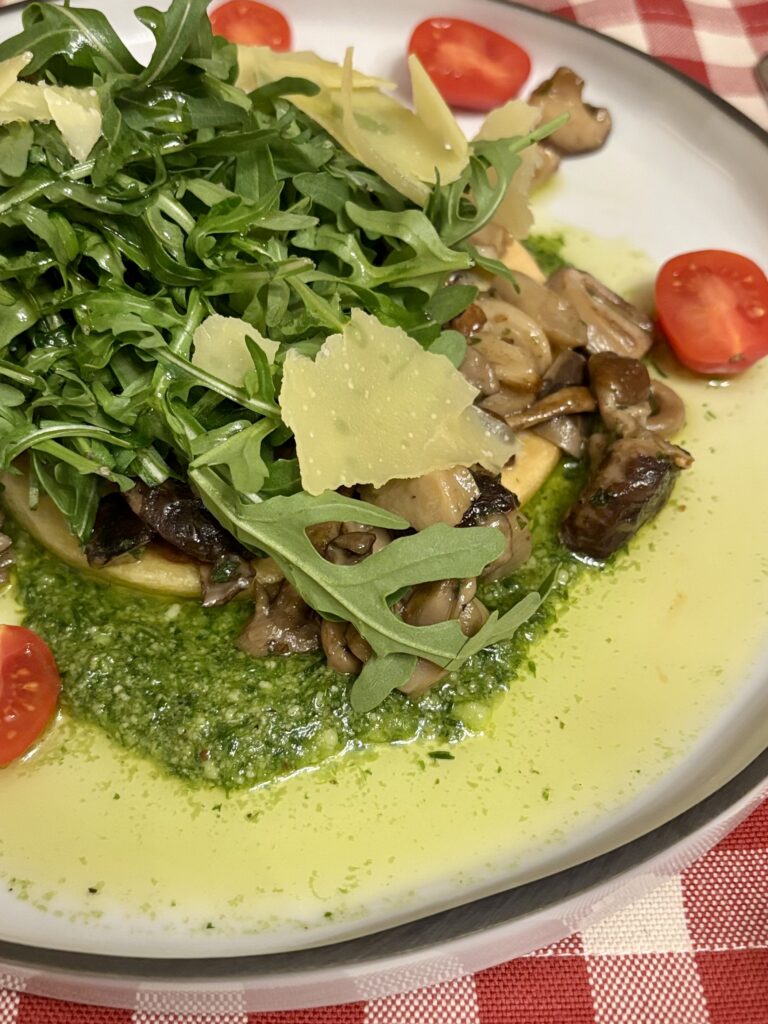 - (2026) la tarte fine aux champignons du moment, roquette et copeaux d’Appenzeller (25 CHF), sans plus selon le Comparse qui l’a commandée