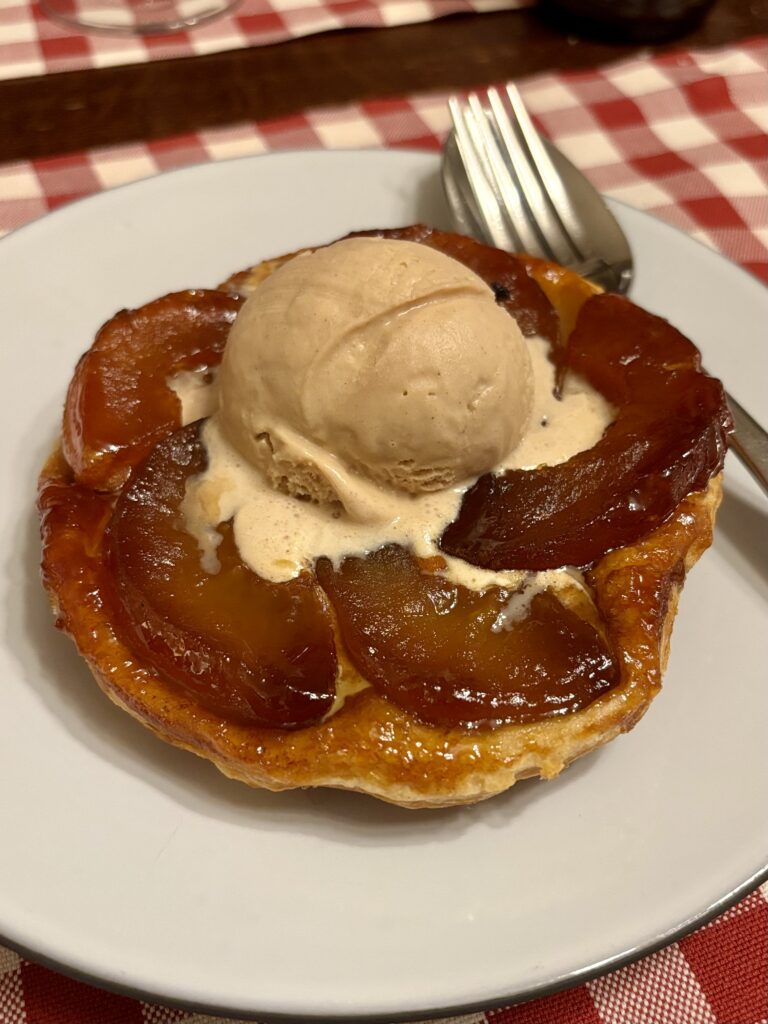- (2026) la jolie et généreuse tarte tatin (13 CHF), servie avec une boule à la cannelle