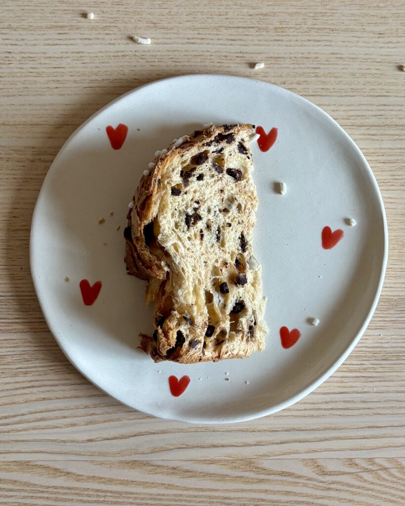 - le panettone au chocolat et paillettes de sucre sur le dessus, bien chocolaté (10 CHF pour la version coeur, 30 CHF pour la version grande)