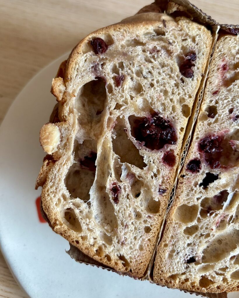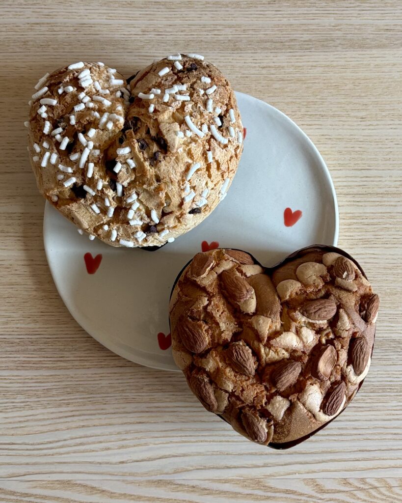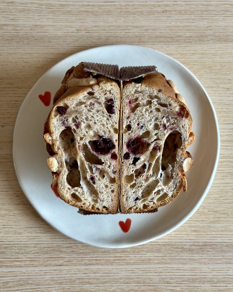- le panettone coeur aux fruits rouges avec des amandes entière sur le dessus pour changer (10 CHF), peu sucré et fruité