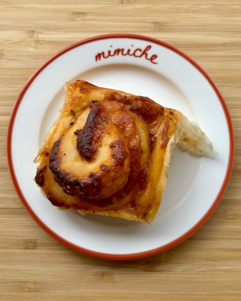 - un plaisant roll salé tomate-mozza-herbes (5.5 CHF), bien moelleux et léger. Si on avait eu plus de temps sur place, on aurait peut-être demandé s’il est possible de le réchauffer quelques instants, car cela doit être meilleur. L’autre saveur du moment était feta-figues, de tête