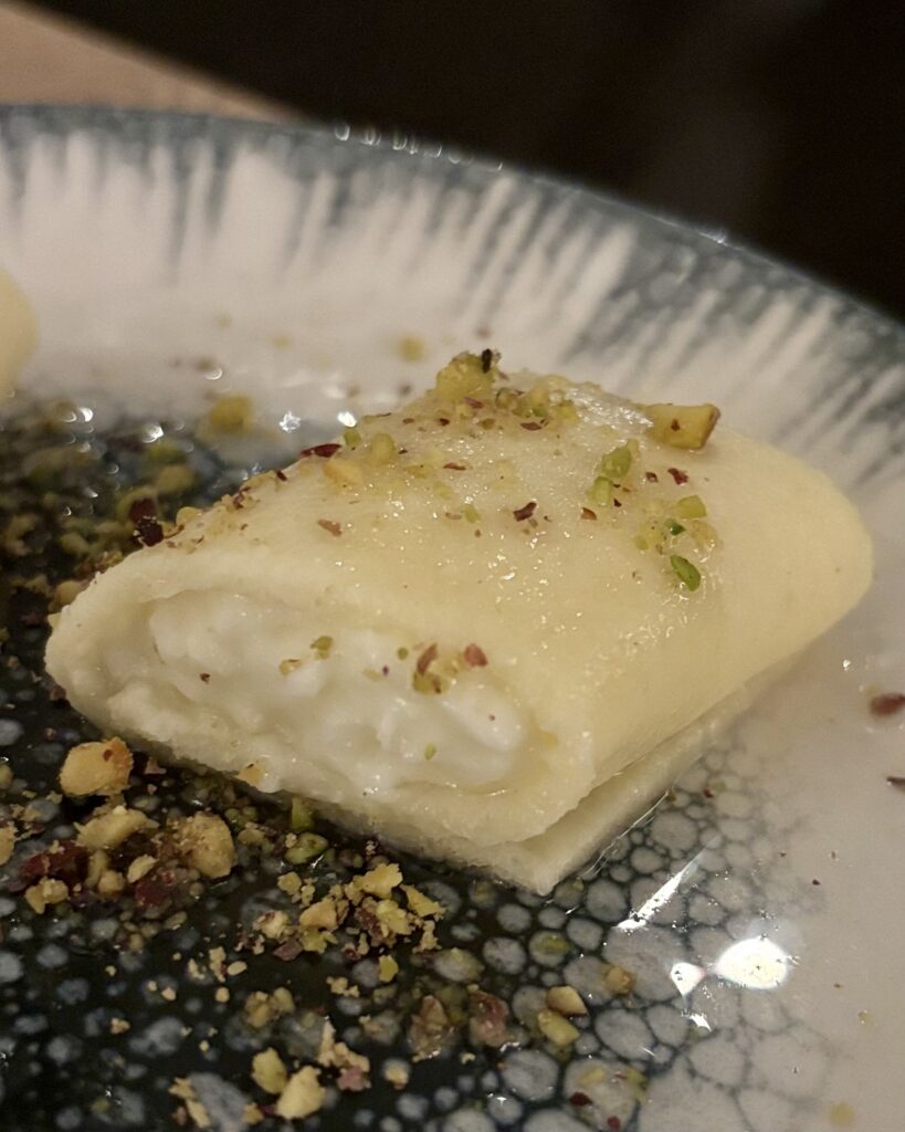 - ainsi qu’un quatuor d’halawit el jibn (7.5 CHF), de dodus rouleaux moelleux de semoule fine et de mozzarella, fourrés d’achta (crème de lait libanaise), également nappés de sirop à la fleur d’oranger et d’éclats de pistaches