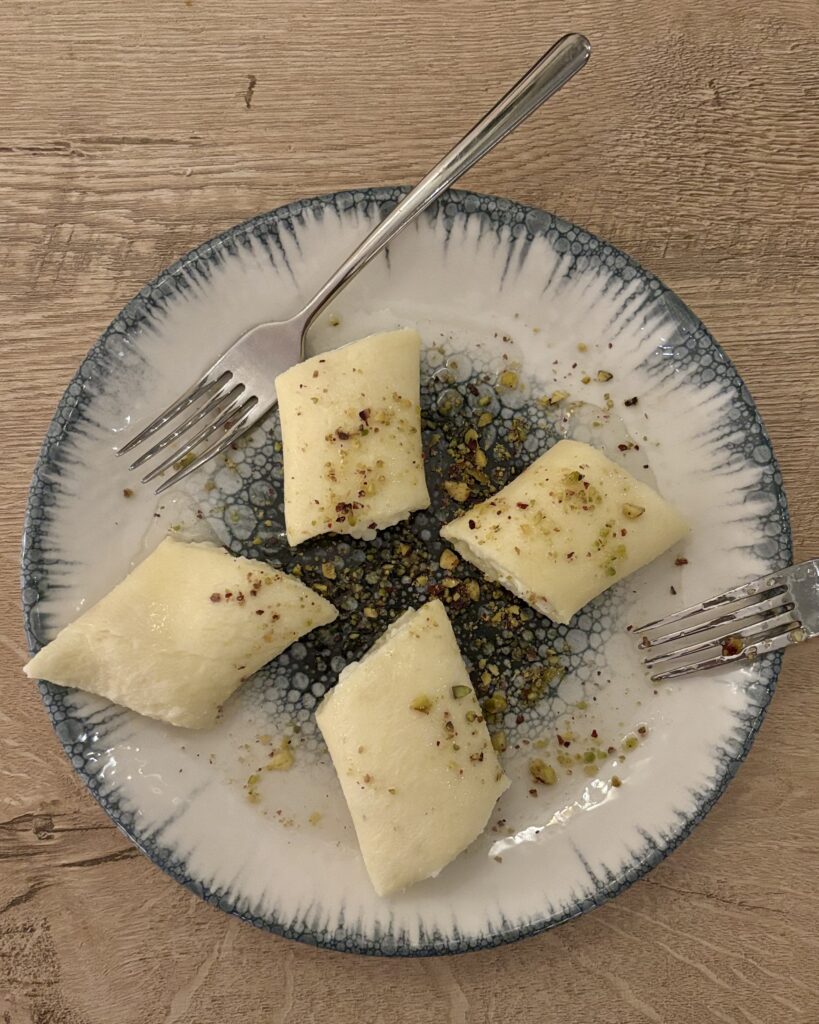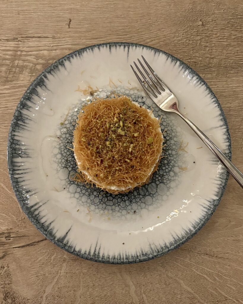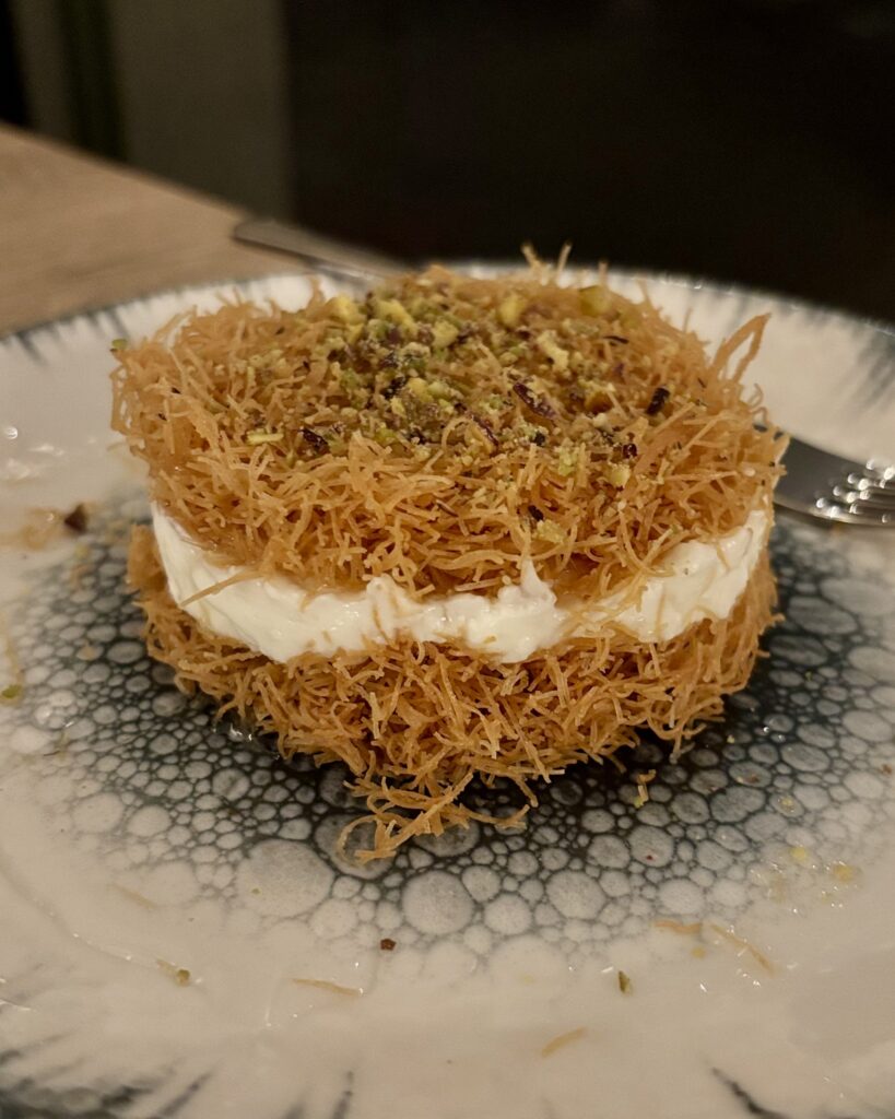 - et en desserts, un beau osmaliyé (7.5 CHF), soit 2 couches de cheveux d’ange crousti-dorés enrobant de l’achta (crème de lait libanaise), arosé d’un sirop de miel à la fleur d’oranger et de pistaches