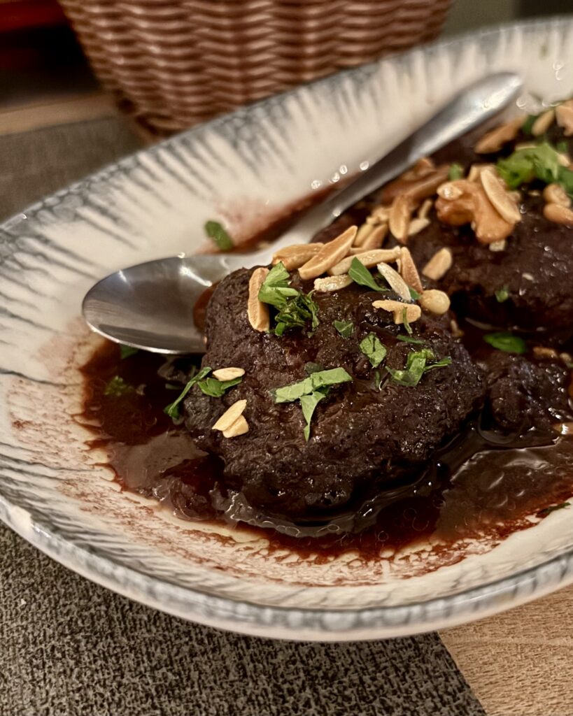- une des autres spécialités de la maison, kafta bil karaz (14 CHF), de grosses boulettes de boeuf poêlées à la compôtée de cerise