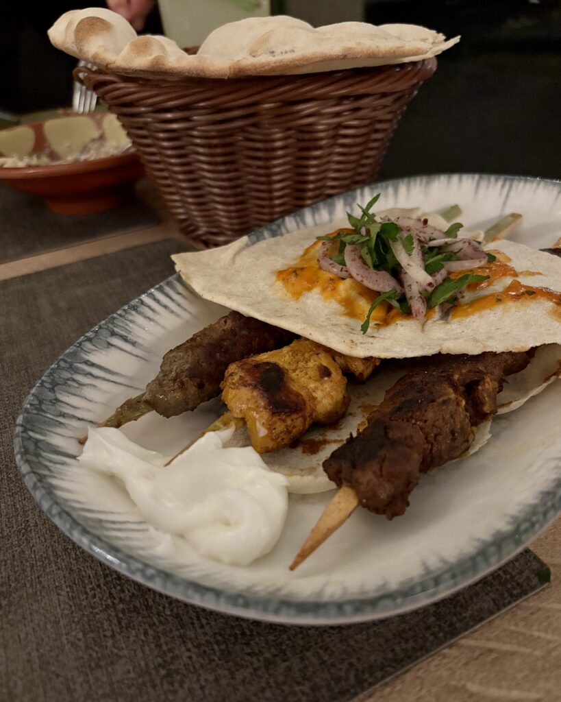- un trio de brochettes mixtes (26 CHF), composé d’une brochette méchoui (boeuf mariné aux épices libanaises), d’une brochette kafta boeuf-agneau et d’une brochette au poulet taouk