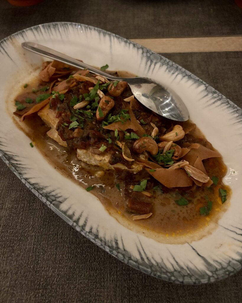 - Et notre plat préféré de la soirée, samké harra, une des spécialités du menu (15 CHF, très généreux): du filet de cabillaud aux épices libanaises, sauce piquante maison, noix de cajou et pain libanais frit qu’on adore. Original et parfumé.