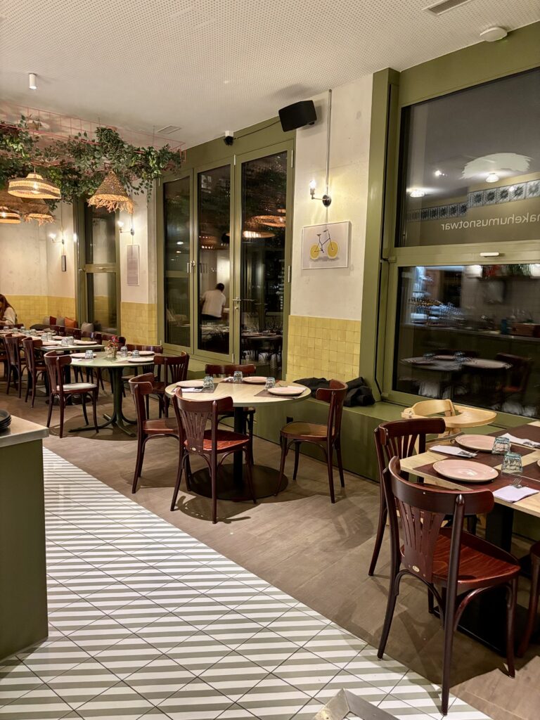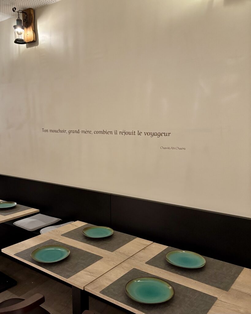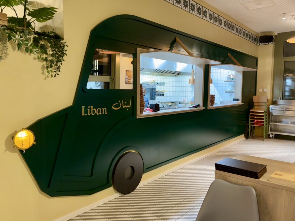 En rentrant, on tombe directement sur un grand food-truck vert abritant la cuisine, tandis que les tables sont réparties entre plusieurs espaces et sur différentes hauteurs: sur la mezzanine du fond, on trouve un doux mélange de tables classiques et de tables hautes verdurées, sous l’oeil de la citation « Ton mouchoir, grand-mère, combien il réjouit le voyageur » du poète libanais Chawki Abi Chacra.