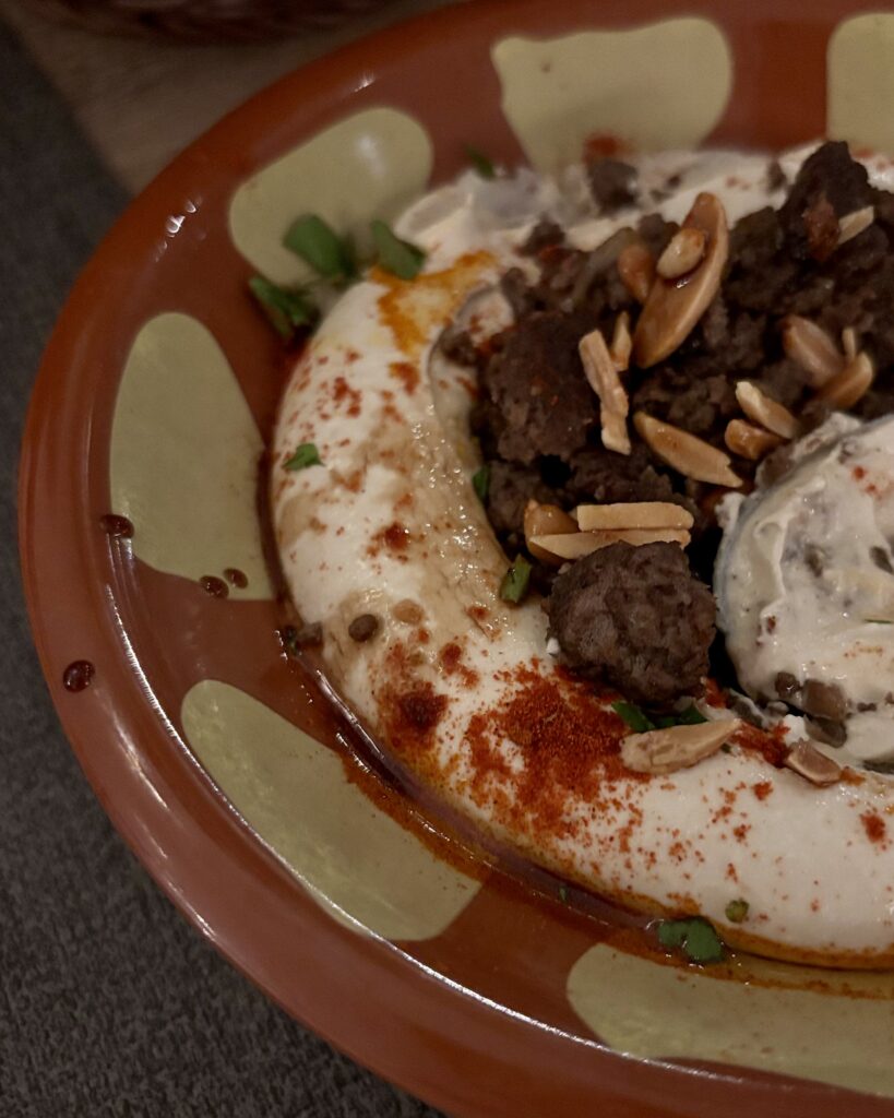 - notre mezzé préféré de la soirée, qui se mange clairement tout seul avec leur excellent pain libanais tout juste sorti du four avec ses grosses bulles crousti-moelleuses: du délicieux houmous bi lahmé (12.5 CHF), une base de houmous crémeux avec de la viande hachée de boeuf suisse à la mélasse de grenade saupoudré de bâtonnets d’amandes et pignons grillés. Un mezzo multi-texturé très réussi et plein de saveurs.