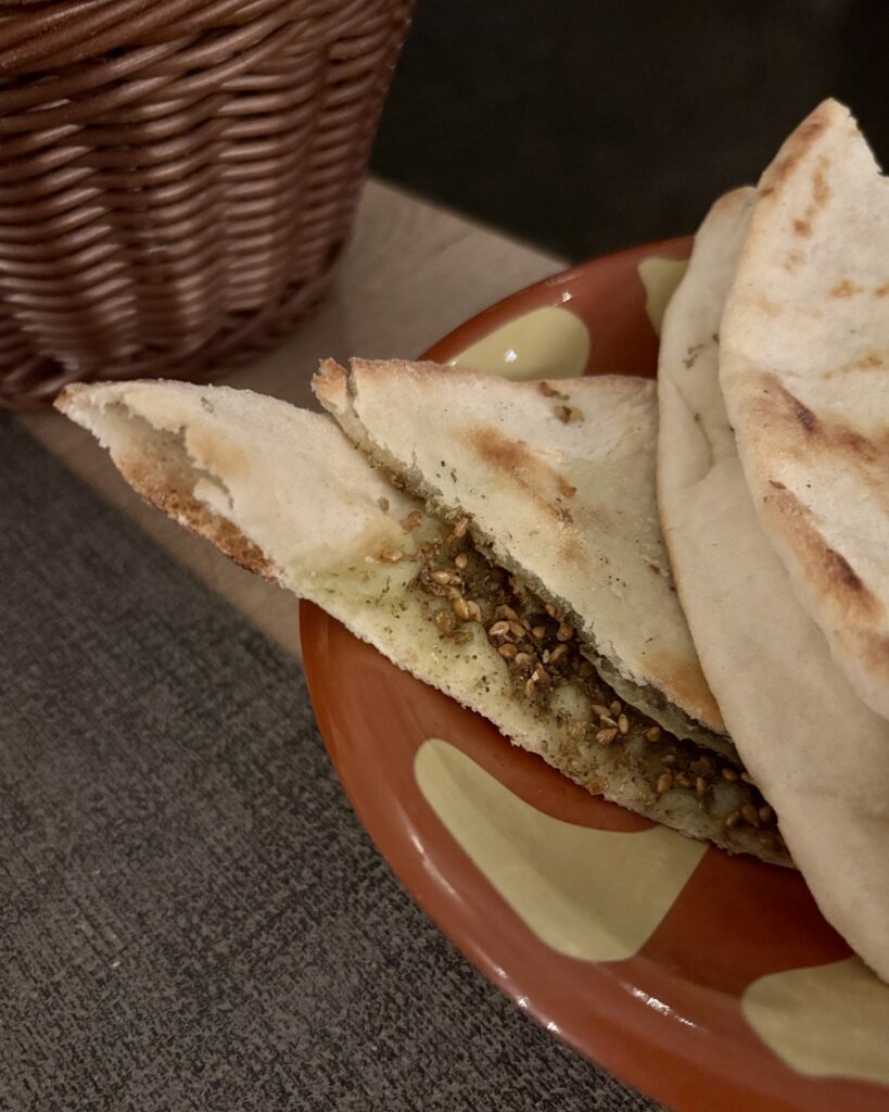 - un man’ouche au zaatar (7 CHF), une galette maison bien moelleuse garnie d’un doux et acidulé mélange de thym, sumac, sésame et huile d’olive