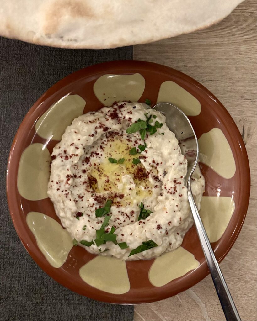 - du moutabal onctueux (10 CHF), soit de la pulpe d’aubergine légèrement fumée avec de la sauce tahina et du jus de citron