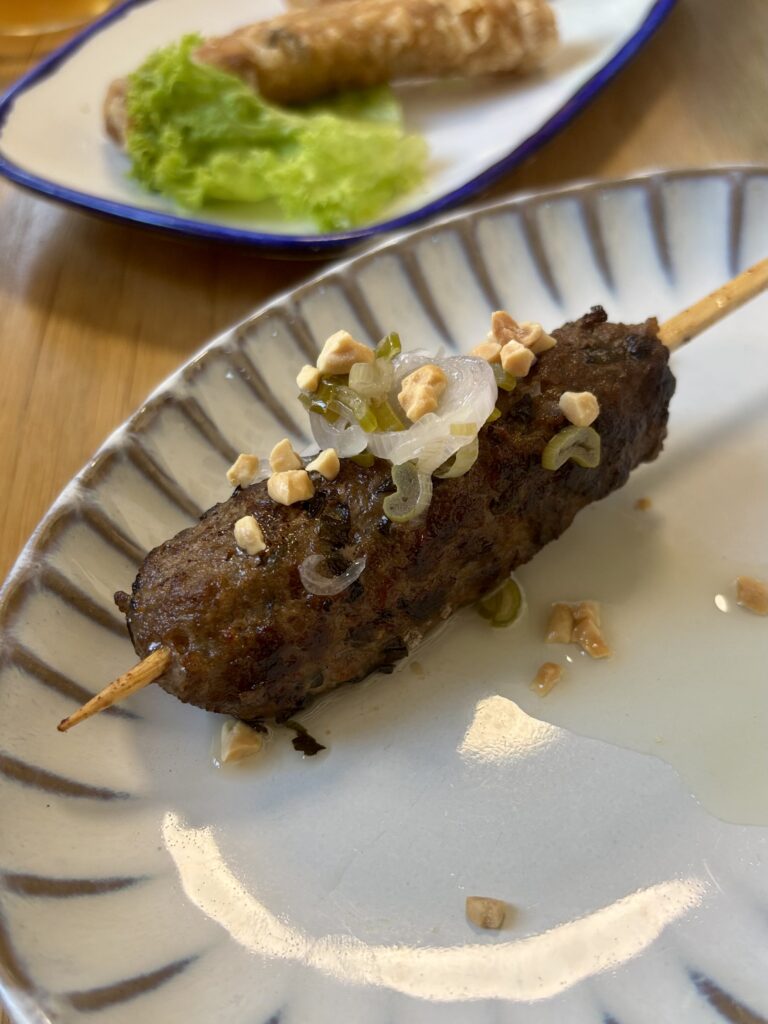 Le menu est sauf erreur similaire à celui de Vevey, avec des doubles prix (à l’emporter ou sur place). On y trouve des bò bún (19.5/24 CHF), des bánh mì (10.9-16.9 CHF), du phở bò et du bún chả (19.5/24 CHF), des rouleaux frais d’été (4.9-5.9 CHF), des rouleaux de printemps/nems (2.5-3.5 CHF) et des brochettes de boeuf (6 CHF), plat signature de Linh. avec quasi à chaque fois des versions végétariennes. Quelques douceurs et boissons (dont du café glacé vietnamien bien sucré comme il se doit et du café viet à l’oeuf) viennent compléter le tout.