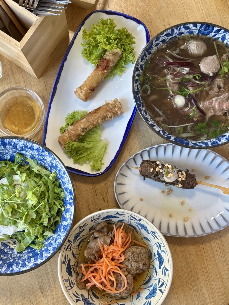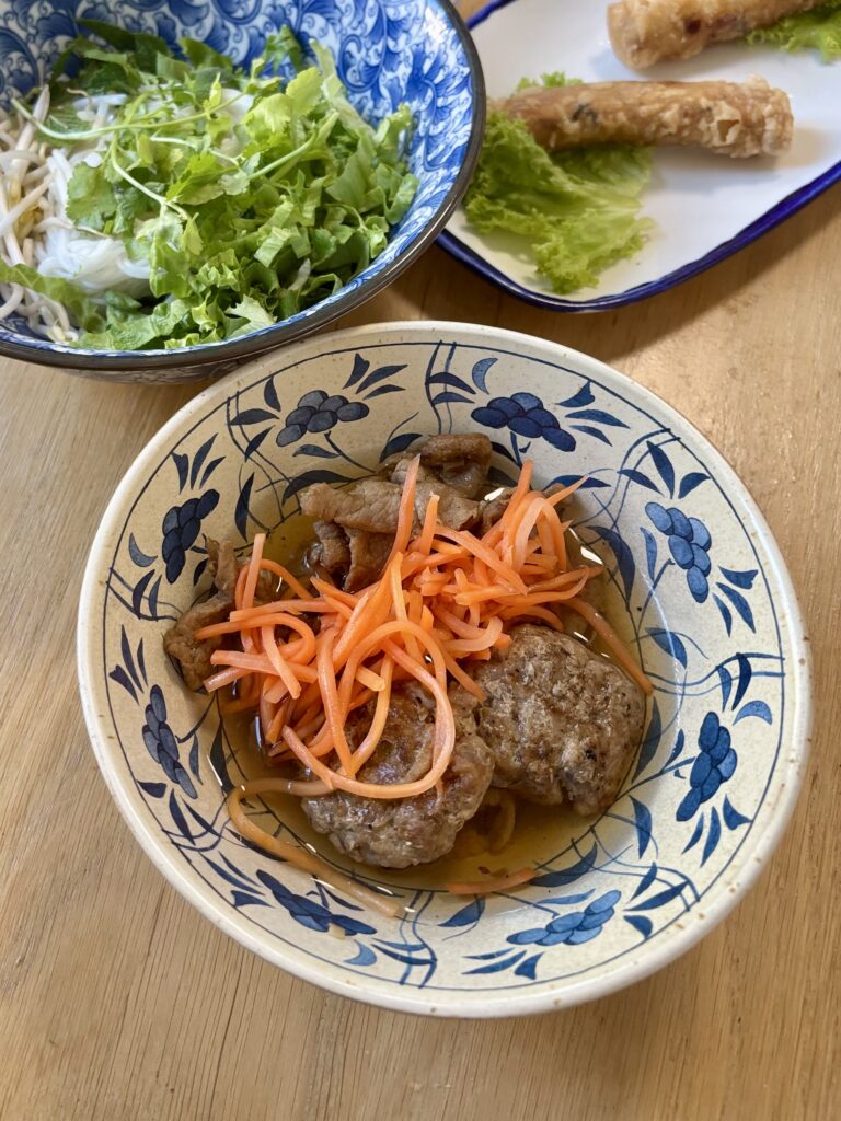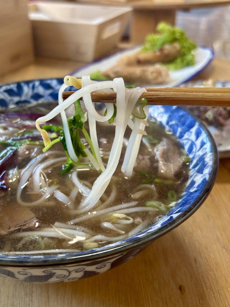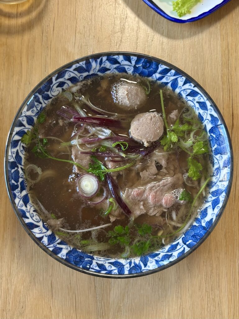 - un bol de phở bò généreux en viande et boulettes de boeuf (24 CHF sur place, 19.5 CHF à l’emporter) dont la recette semblait être en cours de rodage pour atteindre le niveau de la recette de Linh qu’on avait bien aimée à Vevey en décembre 2025.