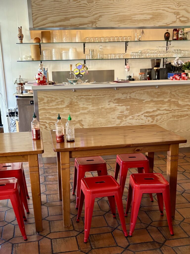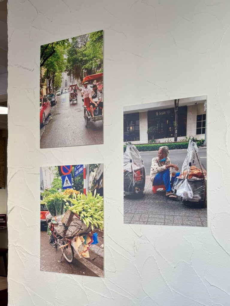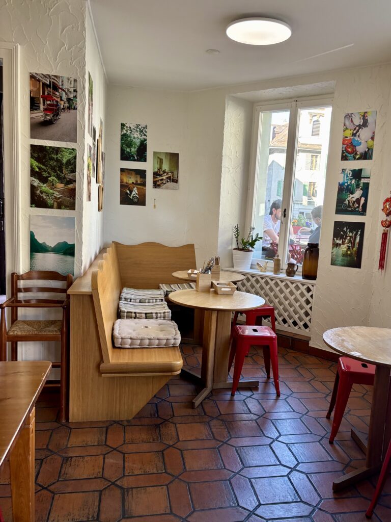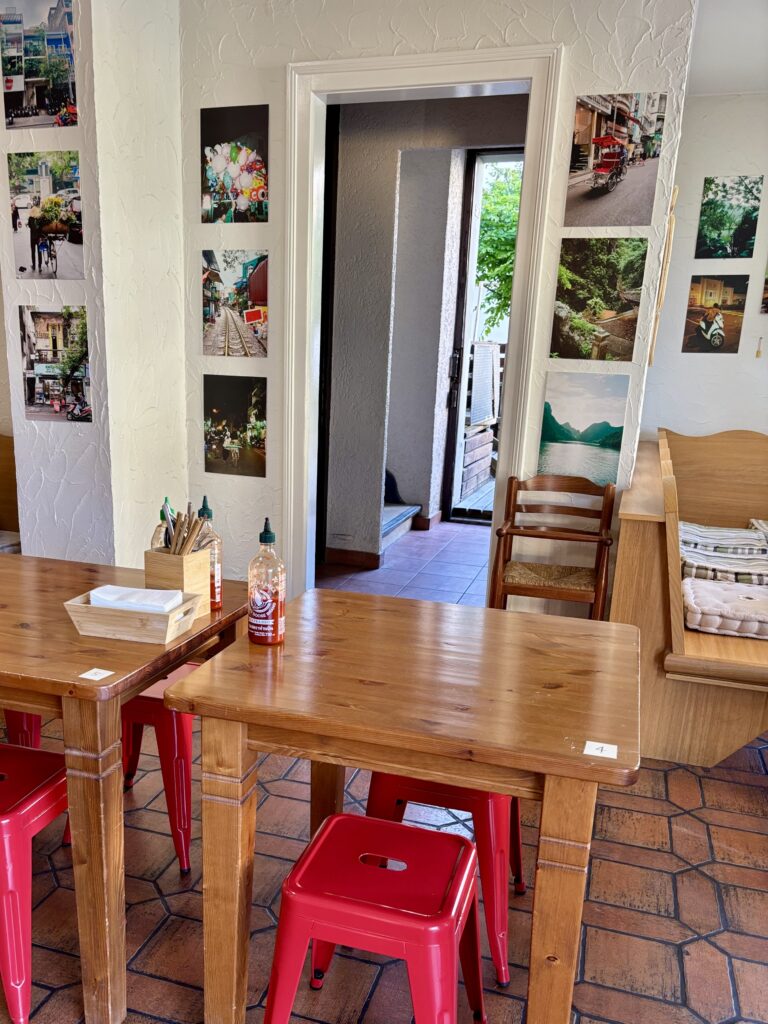 Niveau déco à Cully, des photos de scènes quotidiennes vietnamiennes habillent les murs, tandis que de (hauts) tabourets rouges rappellent leurs petits frères proche du sol sur lesquels ont mange volontiers dans les rues du pays.