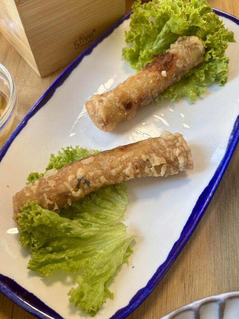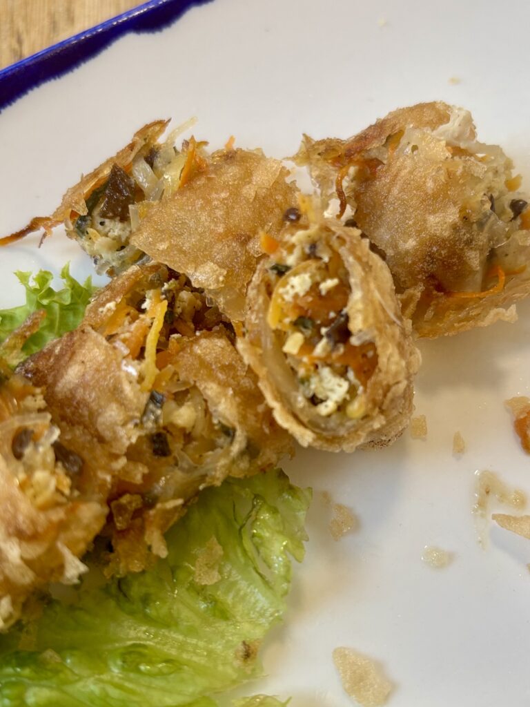 - un duo de bien bons rouleaux de printemps crousti-frits (friture minute), l’un poulet-crevettes (3.5 CHF) et l’autre tofu-légumes (2.5 CHF). On ne court habituellement pas après les versions végétariennes mais ici, l’équilibre entre le tofu doux et les légumes est vraiment réussi, tip top.