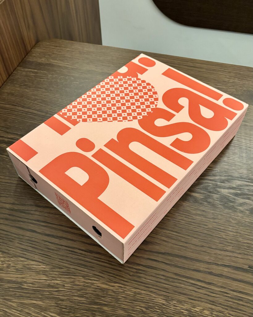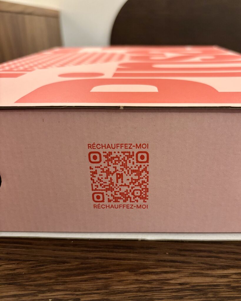 Pour les commandes à l’emporter, l’équipe a développé une boîte spécialement stylée dans laquelle on peut réchauffer au four sa pinsa en suivant les instructions du QR code qui figure sur le côté, instructions qui s’adaptent à chaque recette de pinsa. Système pas expérimenté personnellement mais qui semble fort intéressant.