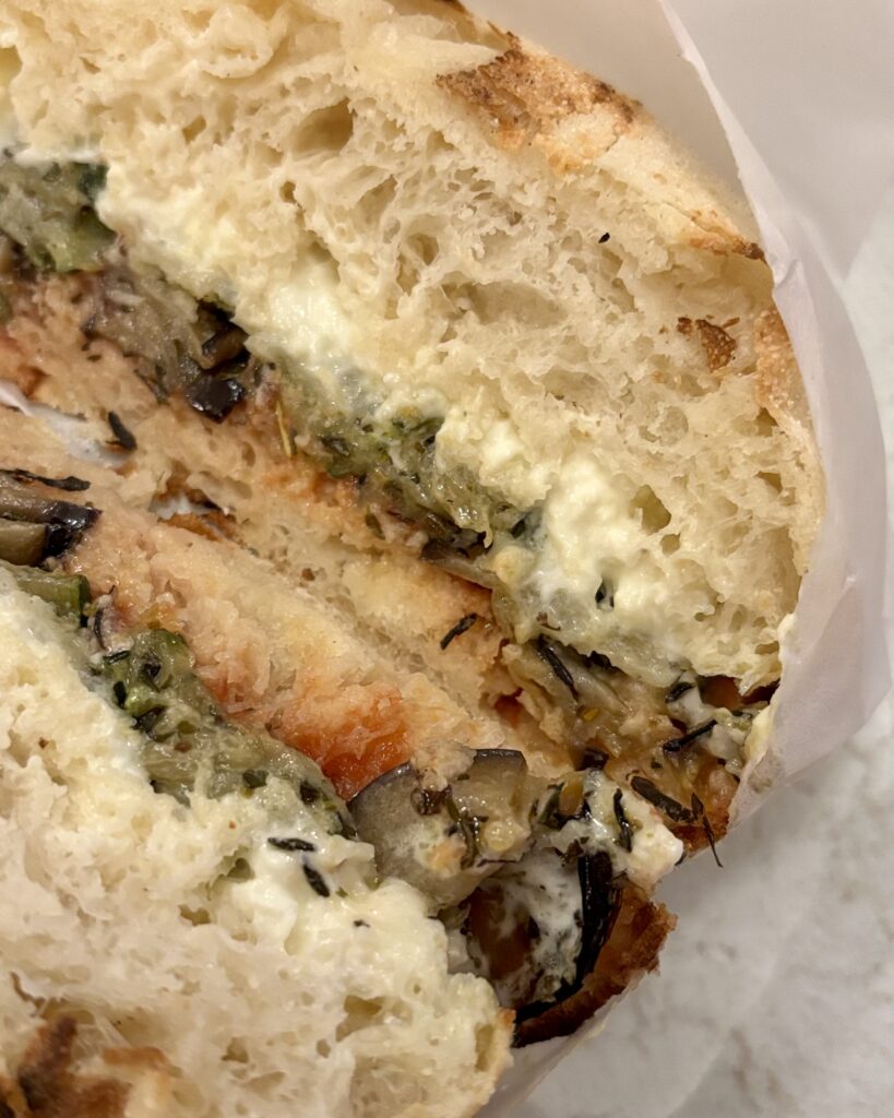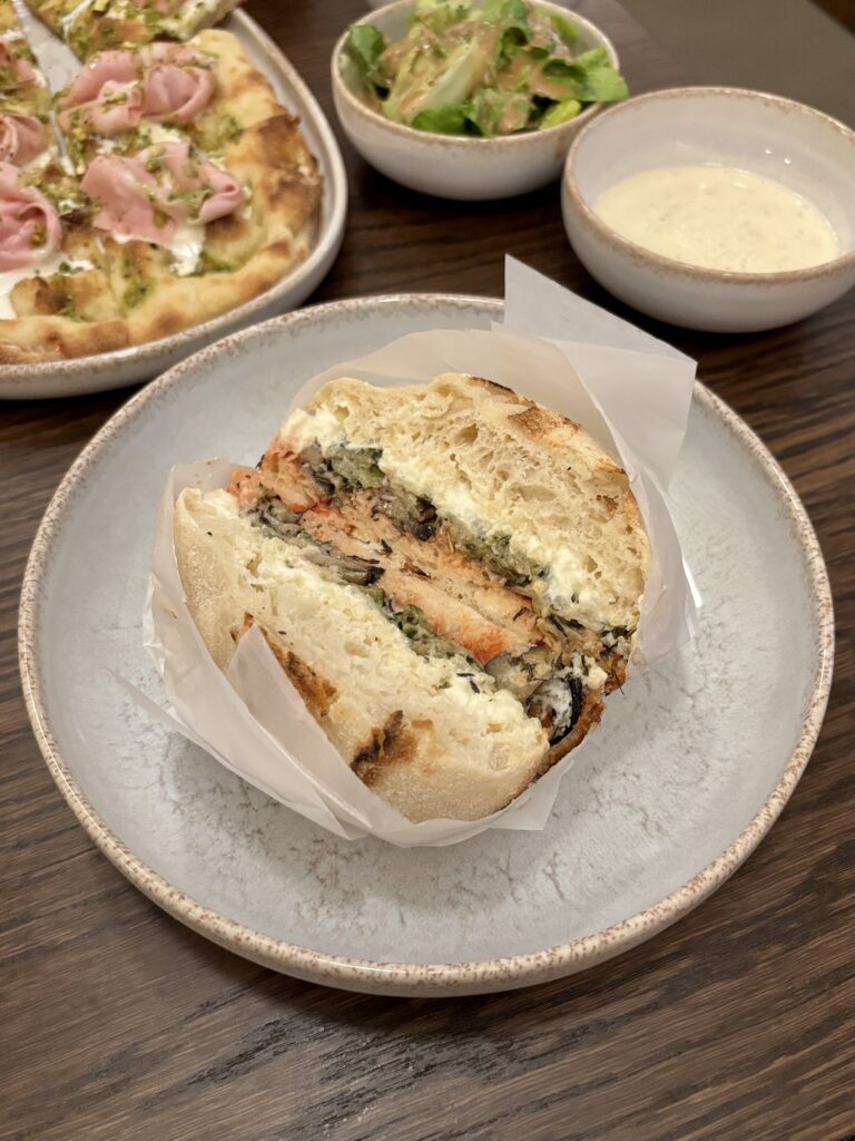 - un pinsa bun VG (15.9 CHF) tout aussi moelleux, garni de sauce tomate San Marzano DOP, aubergines et courgettes rôties, en fines lamelles bien fondantes, herbes de type thym/romarin, parmiggiano reggiano DOP et stracciatella. Des Comparses habitant dans le quartier nous ont dit que le pinsa bun à mortadelle, provolone, mayo et moutarde était délicieux mais comme on avait déjà pris la pinsa à la mortadelle, cela aurait fait un peu monomaniaque…pour une prochaine fois donc.