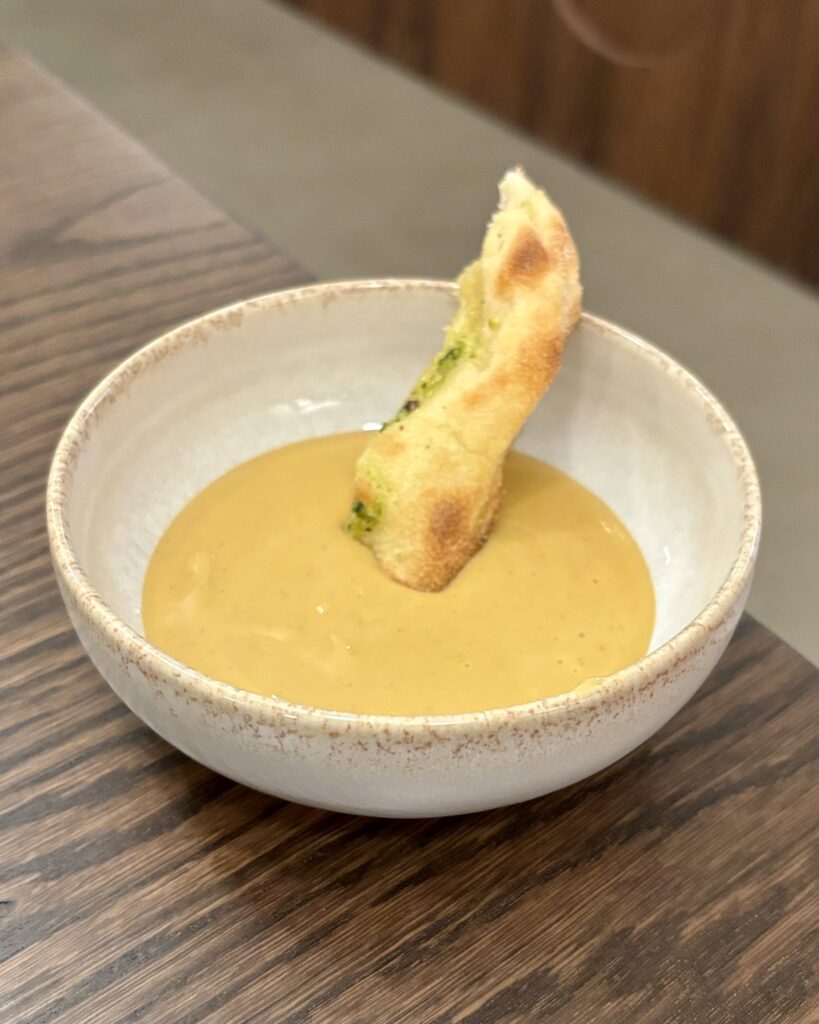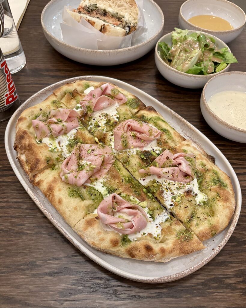 - une délicieuse pinsa Mortadelle (24.9 CHF), probablement le best-seller depuis l’ouverture, de belle taille. Agrémentée de rosaces de mortadelle, straciatella, pesto genovese DOP, pistaches concassées et huile d’olive, la pâte se mangeait tout seule. Et pour ceux qui ne mangent pas les croûtes, on peut les tremper dans des « crust dippers », des sauces maison bien goûtues dont les recettes sont en constante évolution (2 CHF). La honey mustard était particulièrement bien réussie.