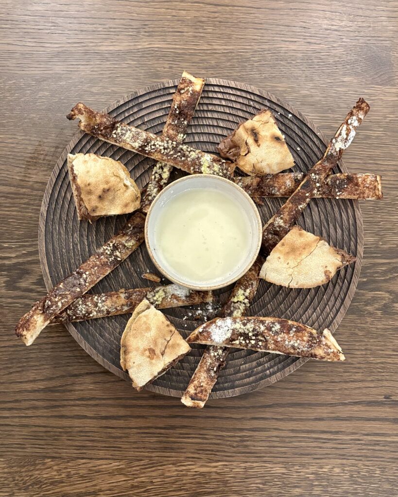 A base de levain, d’un trio de farines de blé, soja et riz et issue d’une fermentation de 72h qui lui développe ses chouettes bulles et son humidité, la pâte à pinsa est en effet réputée pour sa capacité à rester croustillante fort longtemps, y compris quand elle refroidit. Son nom vient du verbe latin pinsere (étirer/aplatir).