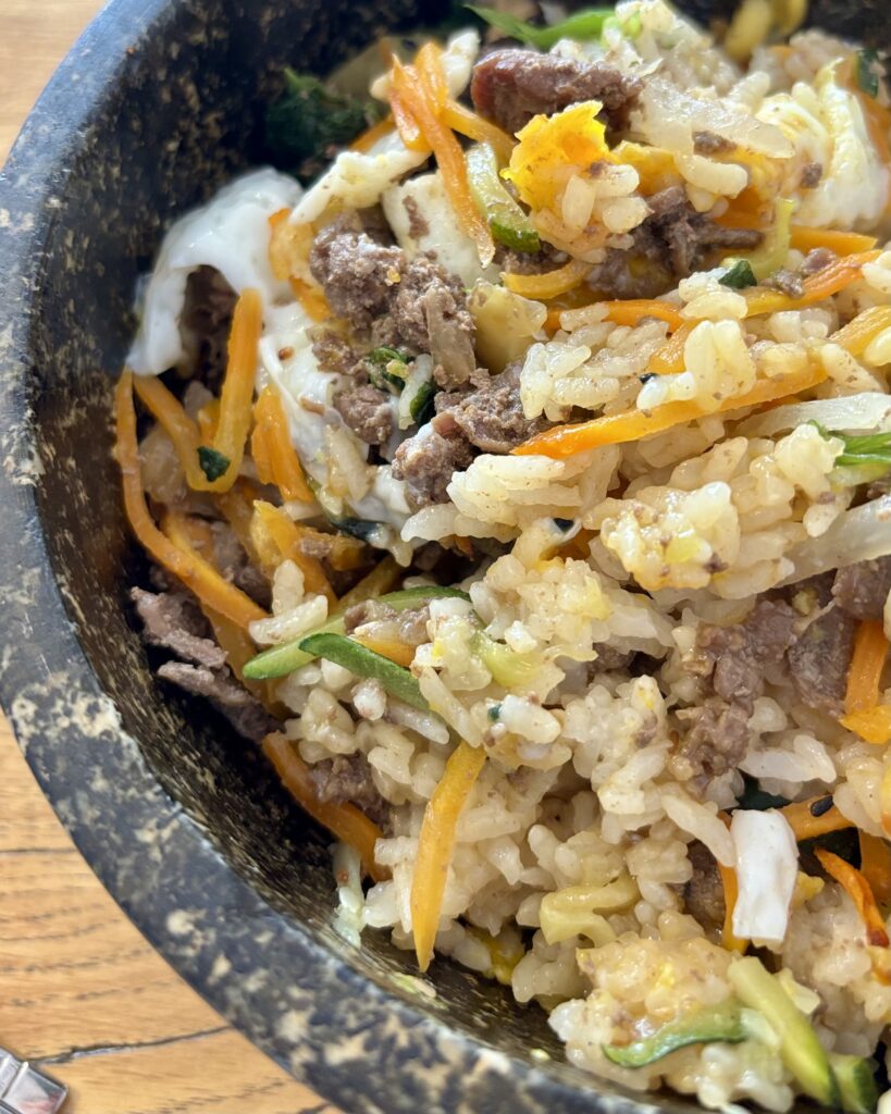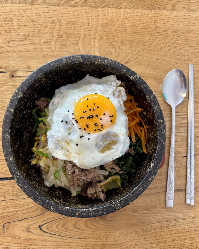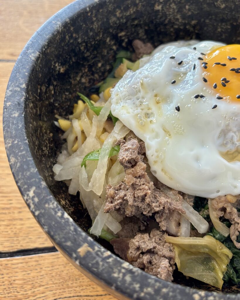 - un tout aussi savoureux dolsotbibimbap (28 CHF), beau bol de pierre brûlant garni de riz, boeuf en fines couches, légumes et oeuf au plat