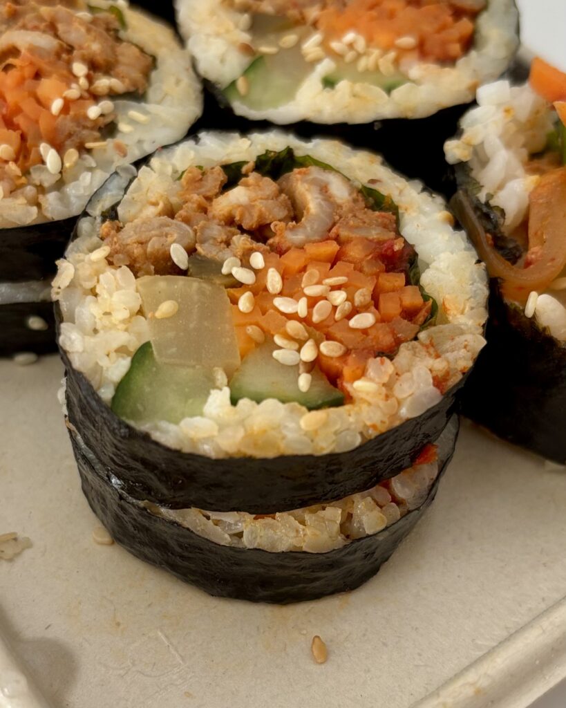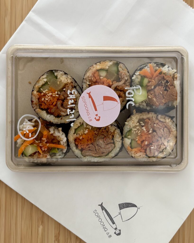 - des gimbap/rouleaux de riz au bulgogi de porc piquant, sympa et croquants (14 CHF), comprenant sauf erreur des feuilles de sésame du jardin qui étaient de saison