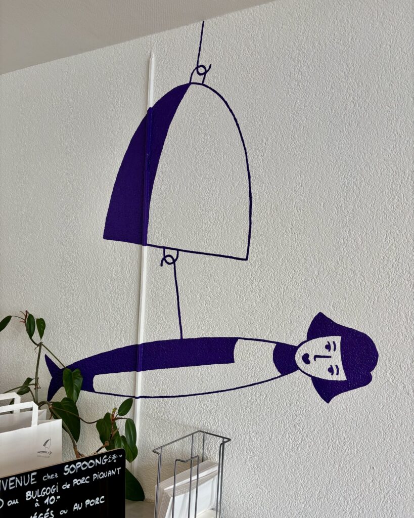 Clin d’oeil à la petite cloche porte-bonheur coréenne accrochée à la porte (punggyeong), le logo transforme le poisson en demoiselle suspendue. Quand à soppong, cela signifie pic-nic en coréen, sauf erreur.