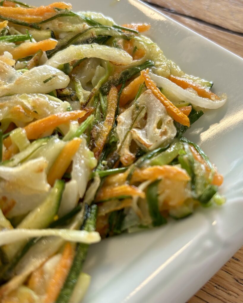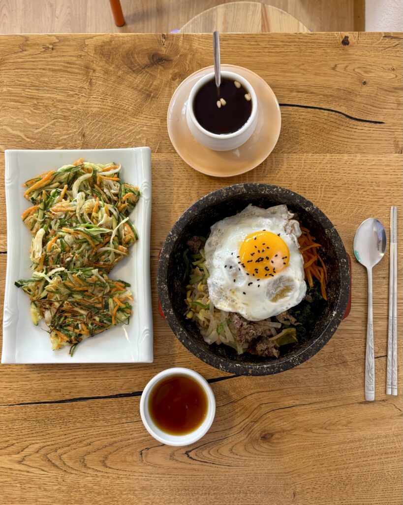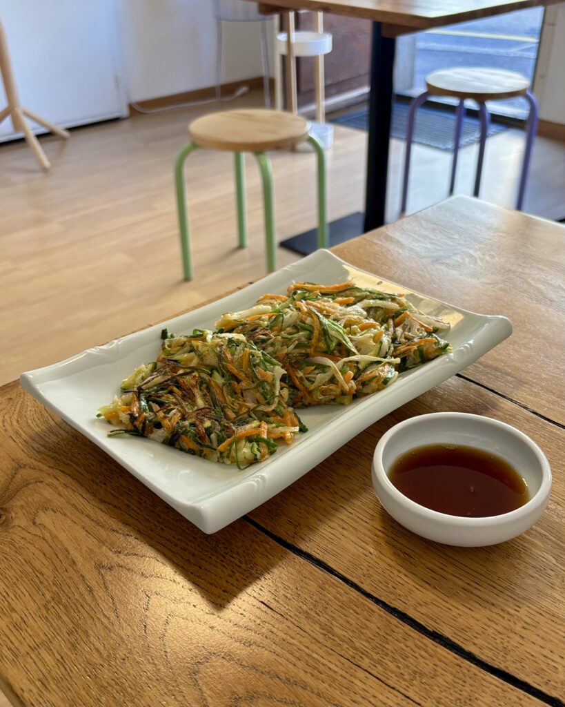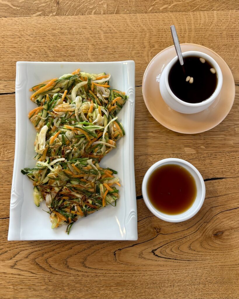 - un délicieux pajeon (12 CHF), sorte de crêpe aux légumes crousti-moelleuse, ici de vraiment belle taille. C’était un plat que feu-Daisuki faisait excellemment (remplacé par Bạn fin 2024): on est ravi d’avoir un nouveau point de chute pour en manger.