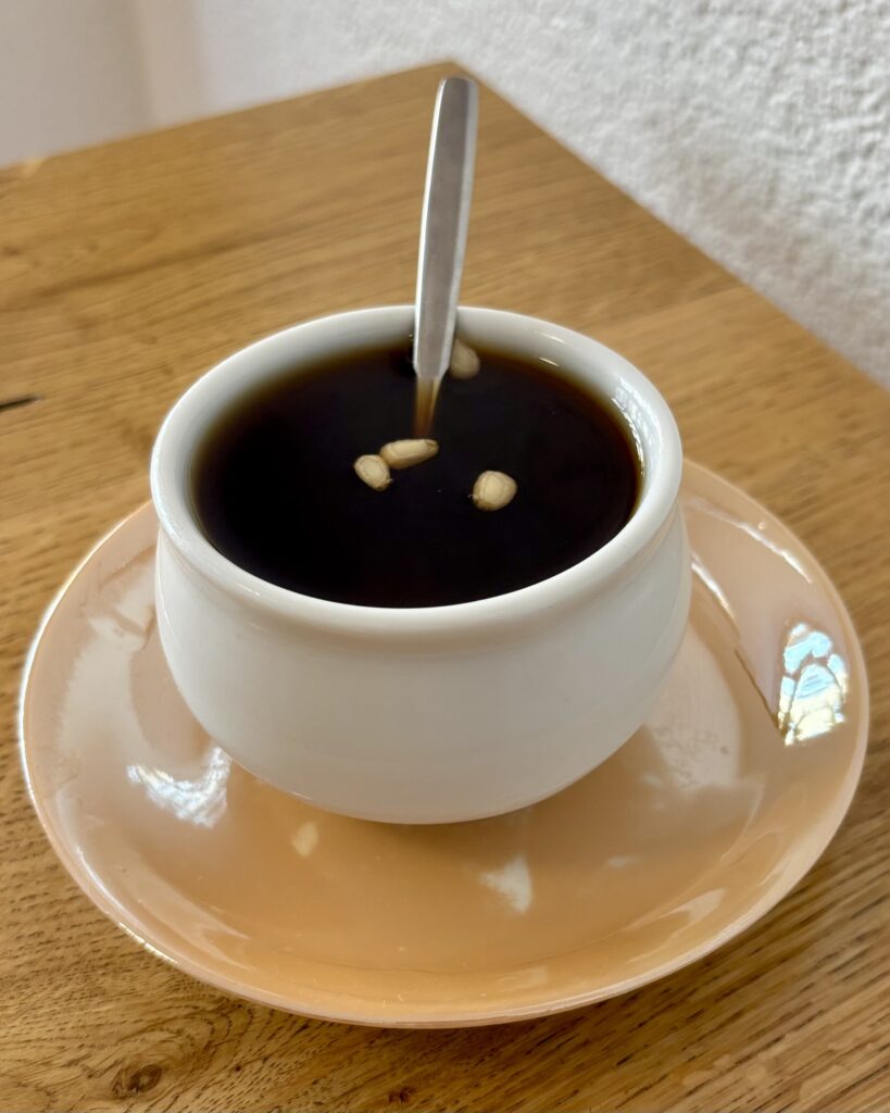 - un verre de soojungghwa (5 CHF), un thé froid coréen à la cannelle et gingembre très très très sucré qui se consomme un peu comme un dessert, qui plaira aux becs à sucre fans de cannelle